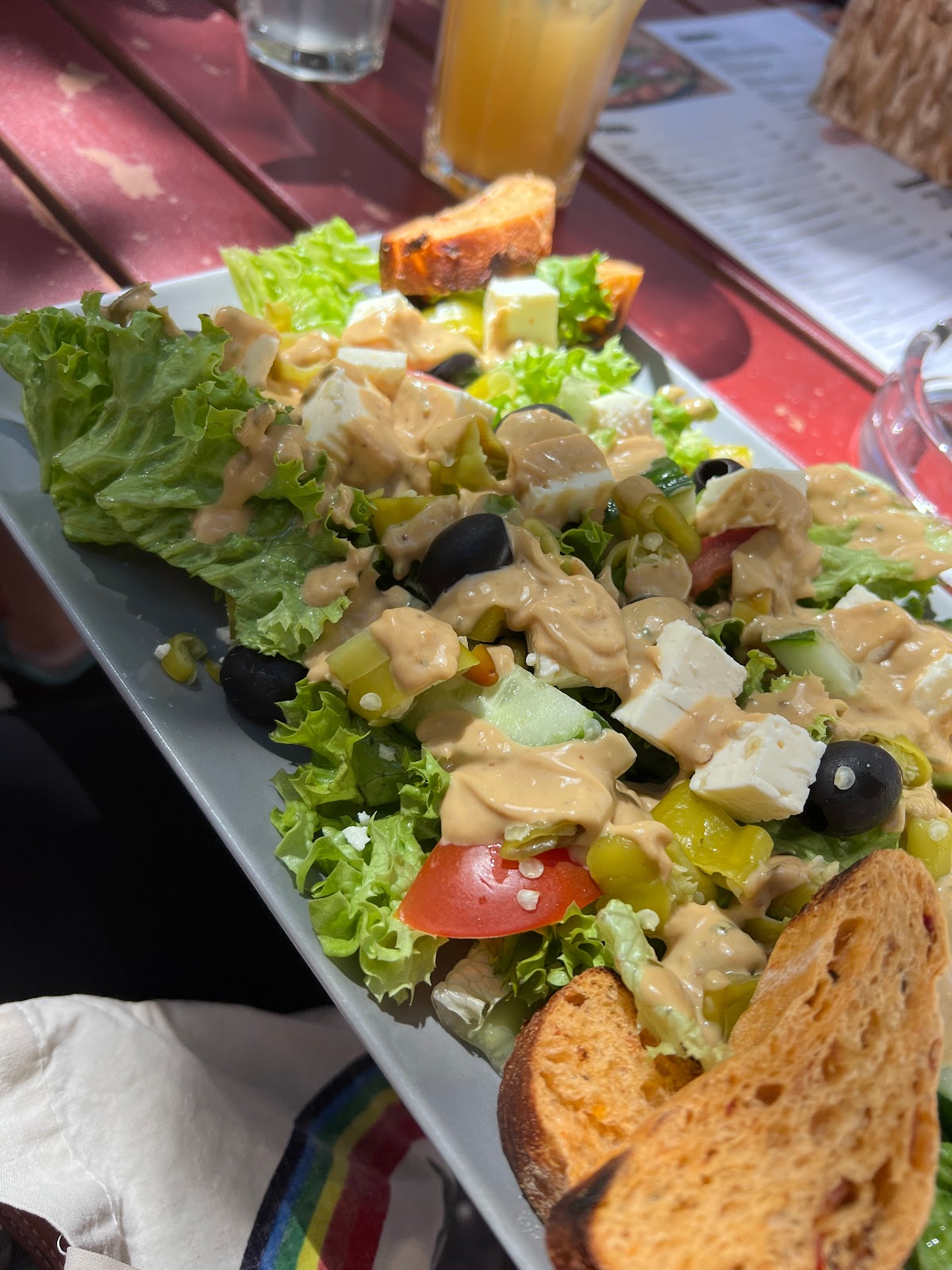 It was an absolutely horrific hot day in Heidelberg and unfortunately, we couldn't stomach anything heavier than salads! We had veggie salads and they were fresh and lovely. The staff was approachable and friendly. They got our orders quick, served our drinks really fast. Food followed promptly. They had good tables in the shade which was great for such a hot day. We were able to pay by card inside the restaurant which was great.