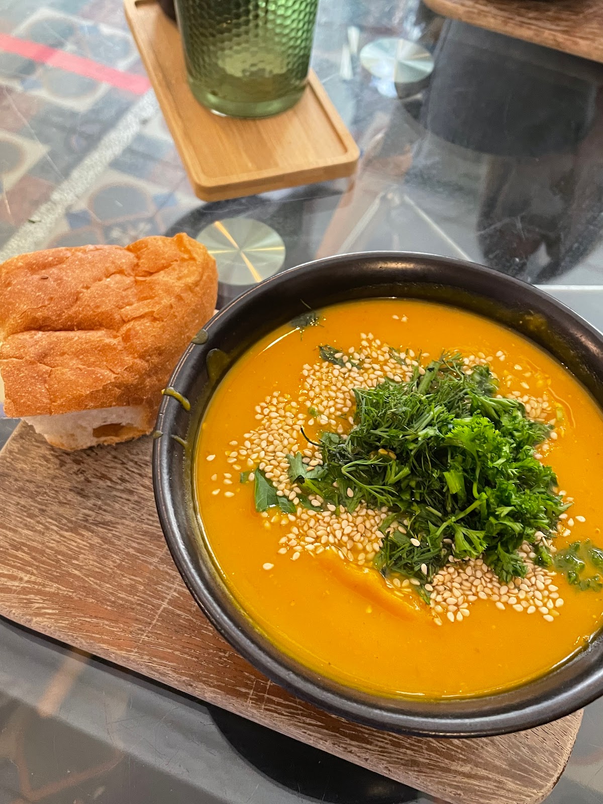 This was pumpkin soup (which is gonna go off the menu since it’s not in season anymore), sesame seeds and tahini ????