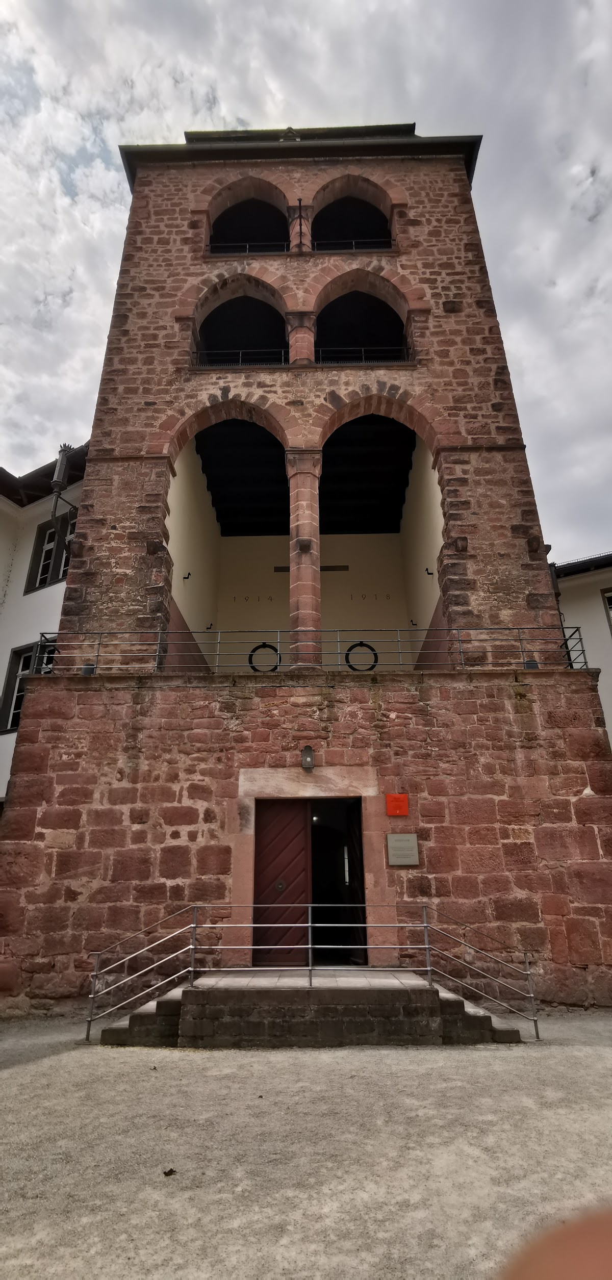Heidelberg's Hexenturm, a tower used until 1392 as part of the ancient city's western fortifications, is the last remnant of its Medieaval walls, and is now built into the courtyard of the New University. The name "Hexenturm", in use for this site since 1684, is a misnomer as there are no records that the building ever held women accused of witchcraft or sentenced as witches, a period of time which occurred in the last half of the 13th century. It was, however, a prison for thieves. The present hipped roof was added after parts of the old tower were destroyed during the Palatinate Succession (1688 to 1697), including the old peaked roof. The tower is not only an important historical landmark within Heidelberg, but a Memorial for university students and staff who fell in World War I.