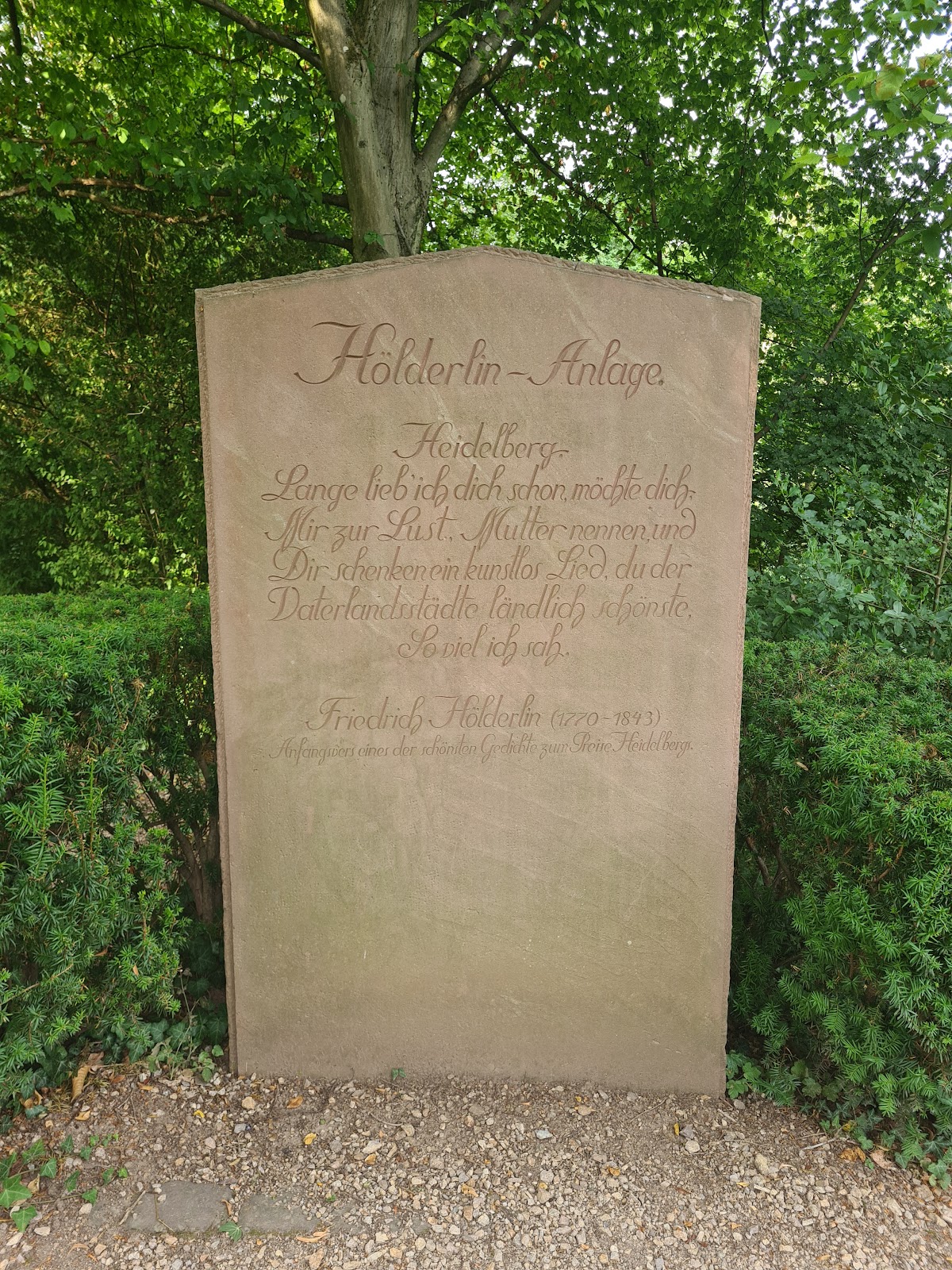 (Translated by Google) At the eastern end of the Philosophenweg there is a small park with the Hölderlinstein and the first stop of his Heidelberg ode in memory of the poet Friedrich Hölderlin (born March 20, 1770 Lauffen am Neckar, † June 7, 1843 Tübingen):