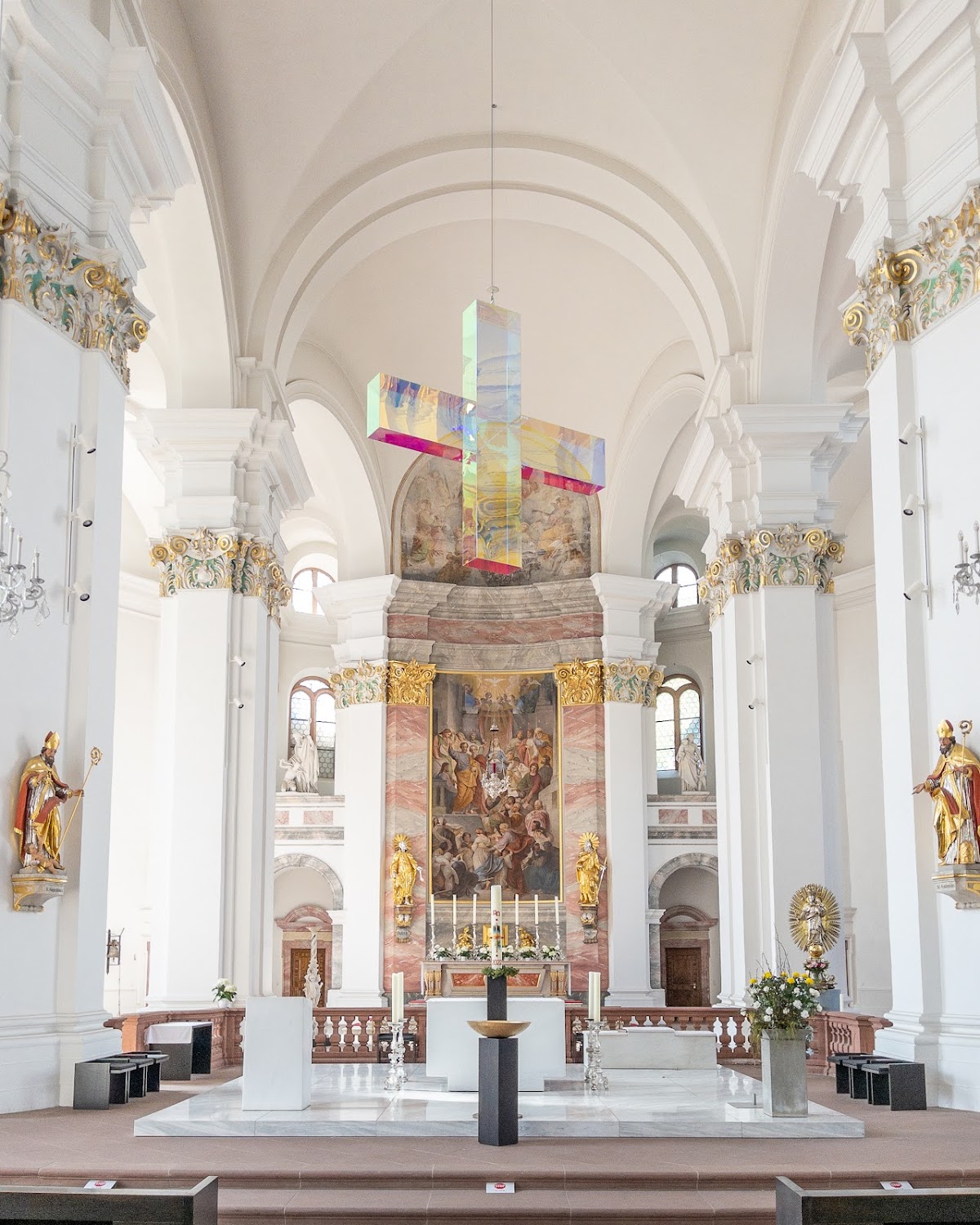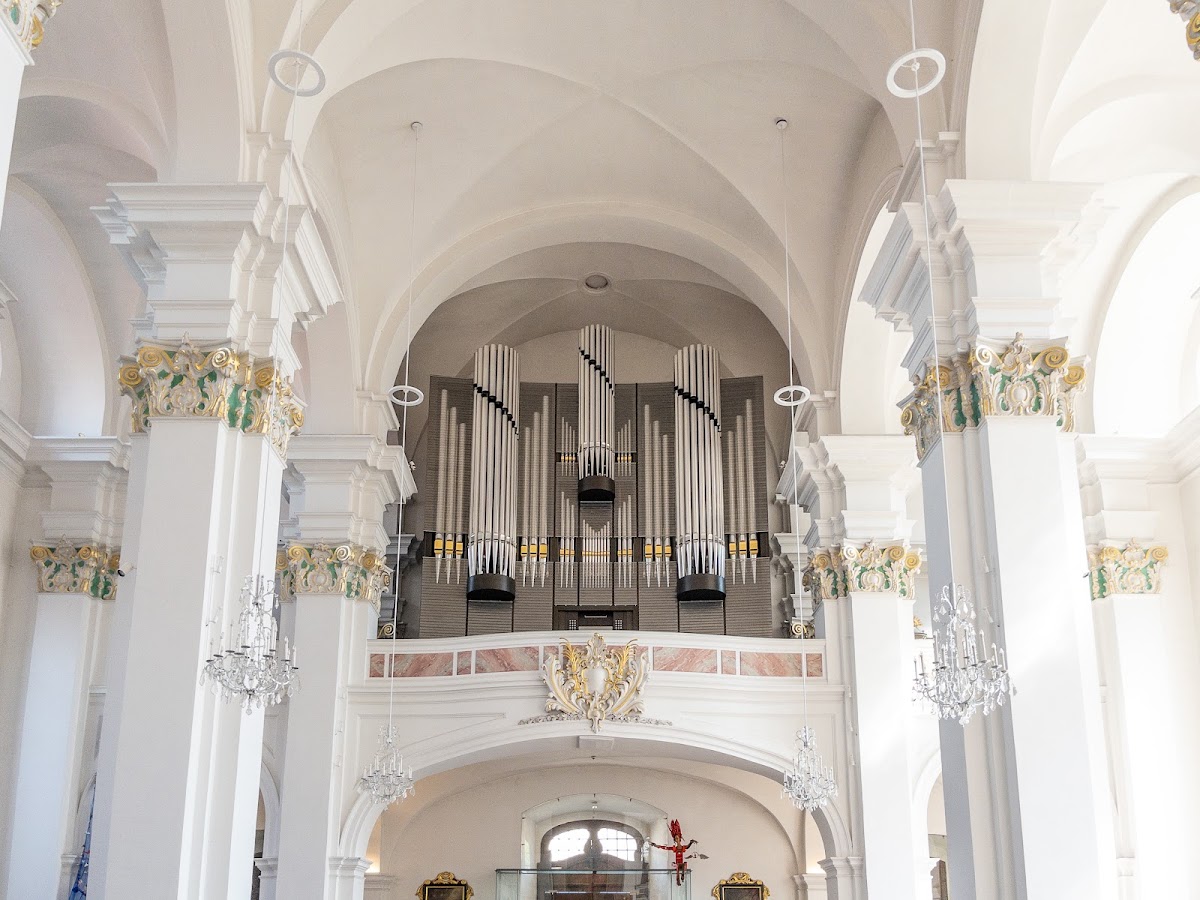 The Jesuit church in Heidelberg is plainly decorated in an overall white theme. The courtyard is peaceful and adjacent to the seminary with gardens on both sides of the wall. Wonderful organ near the entrance on the second level and another organ toward the front on the right side. Stylish cross free swinging in the breeze, Recommended for some quiet time and meditation.