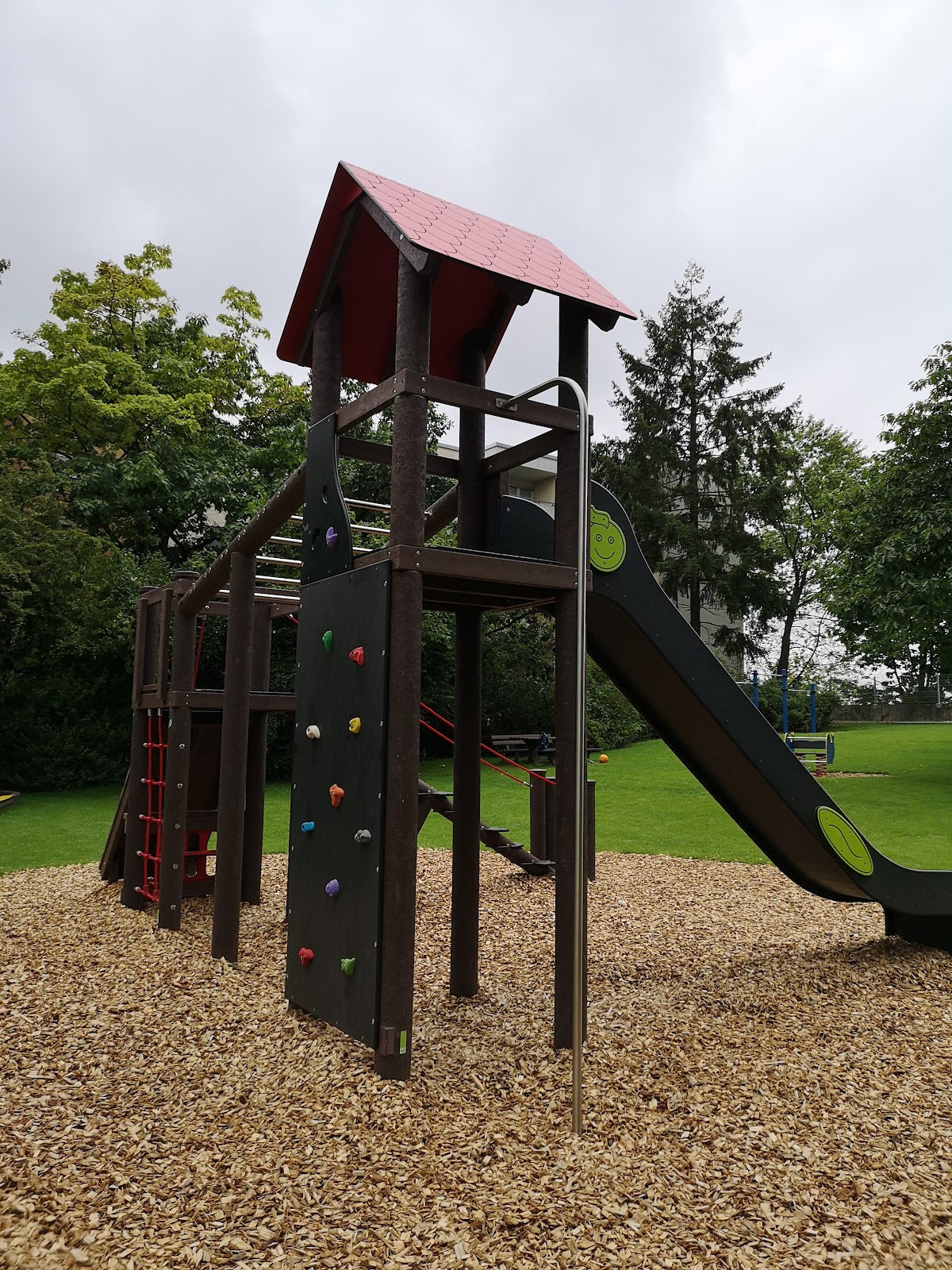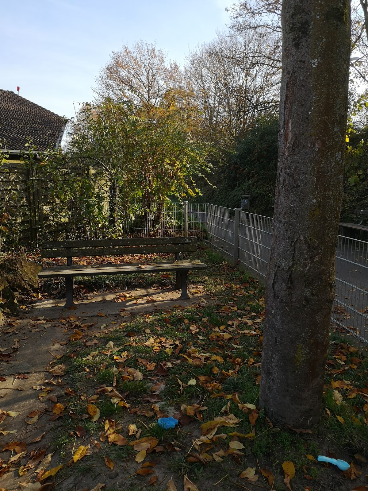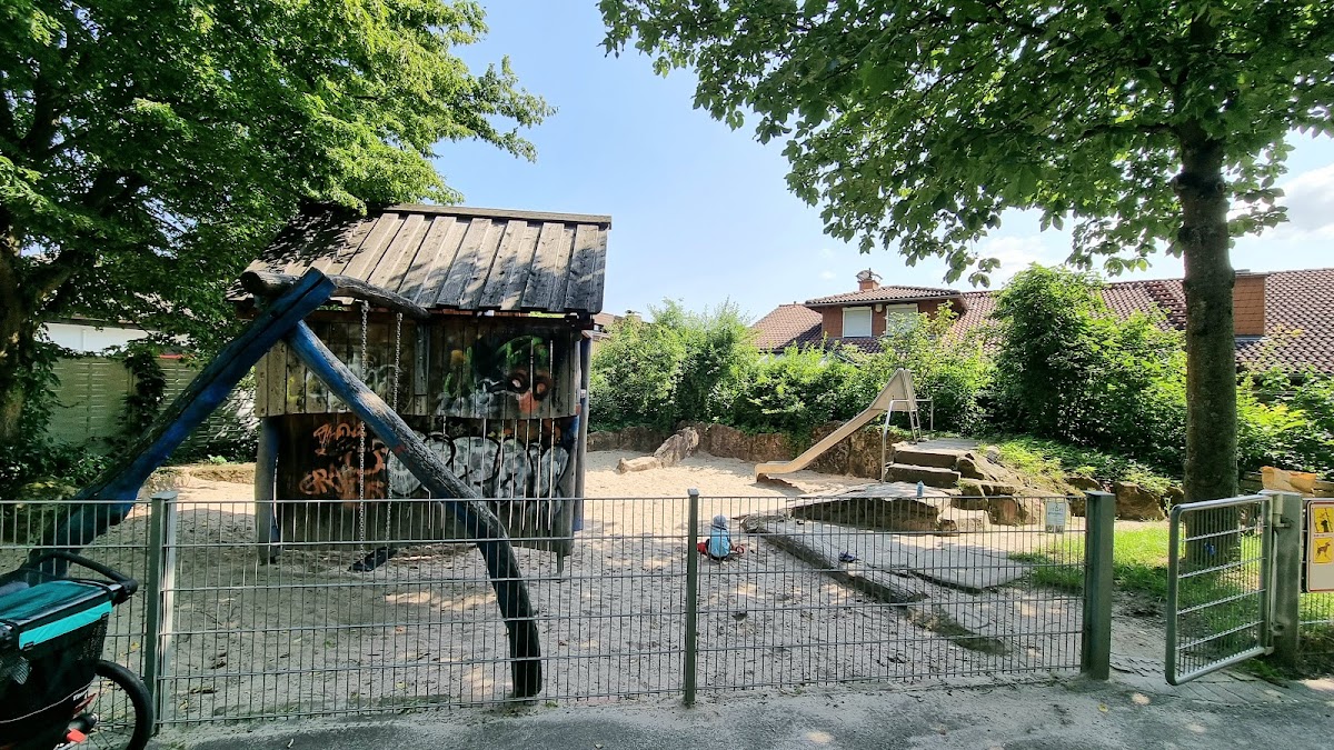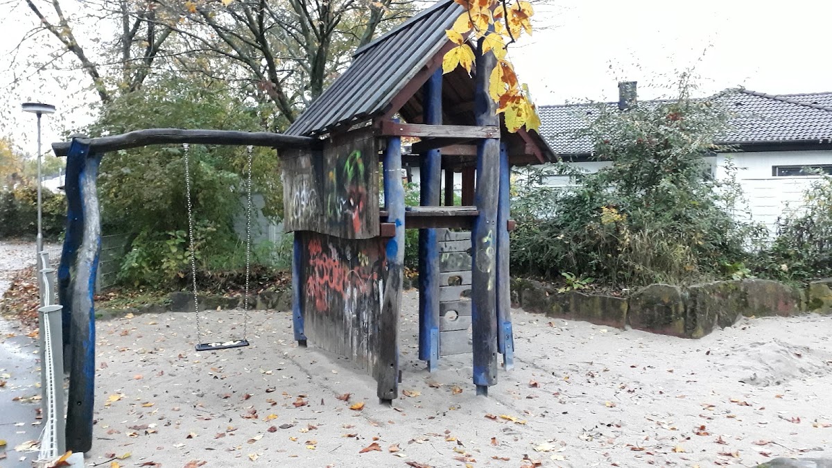 (Translated by Google) Small, fenced playground with a slide, sandpit, swing and wooden tower. The tower has a straight ladder. Unfortunately, there is nothing further above. A slide/slide would be great here. The wooden tower is partly weathered and smeared.