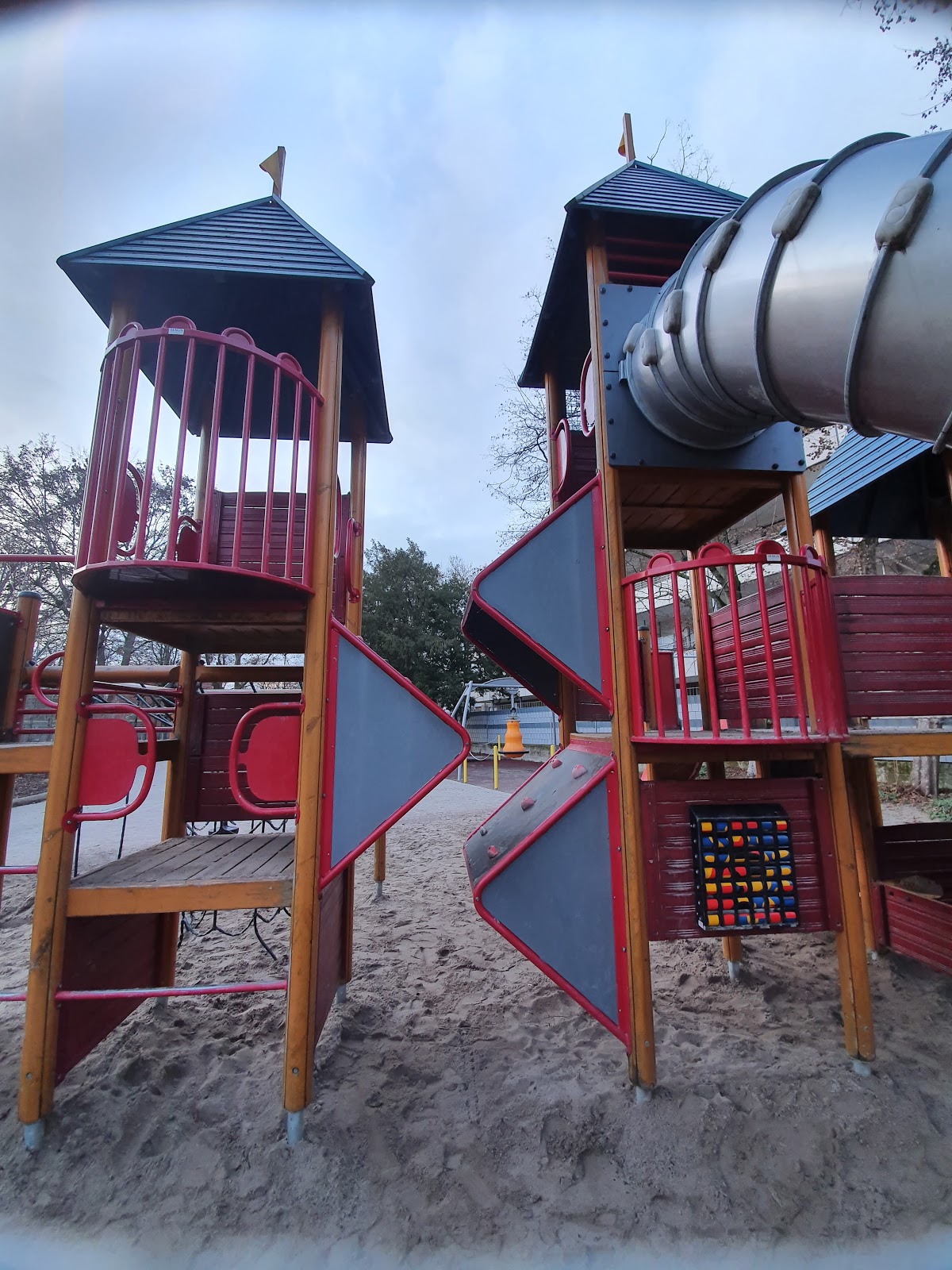 Kleiner, eingezäunter Spielplatz mit Rutsche, Sandkasten, Schaukel und hölzernen Turm. Der Turm hat eine gerade Leiter. Oben ist leider nichts weiter. Hier wäre eine Rutsche/Rutschstange toll. Der Holzturm verwittert zum Teil und ist beschmiert.
