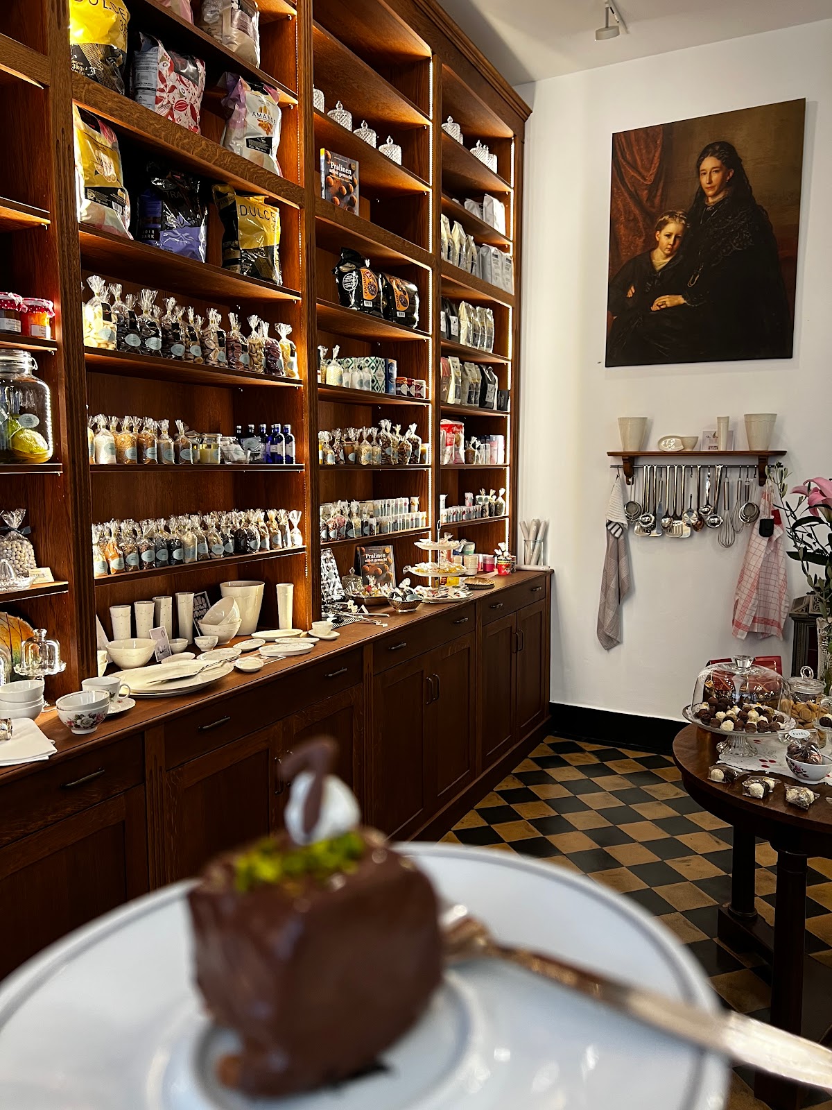 Tolle Auswahl von Desserts in Weckgläsern und leckeren Pralinen, alles hausgemacht. Außerdem diverses Equipment zum Backen. Sehr schön gestaltet - so stellt man sich ein Geschäft im Paris der 1920er Jahre vor.