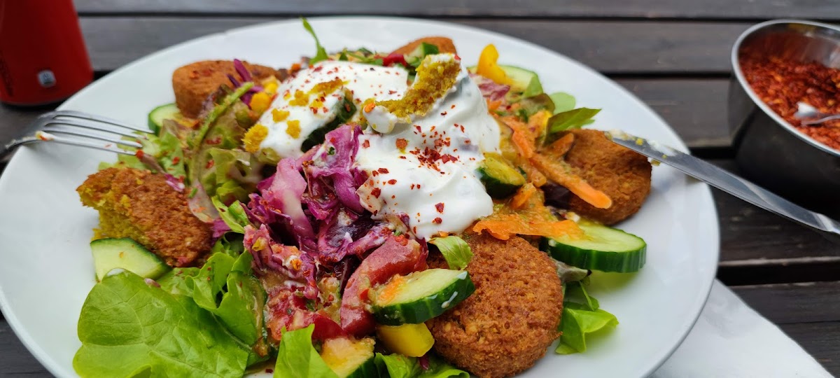 unexpectedly tasty falafel and pizza. vegan options available