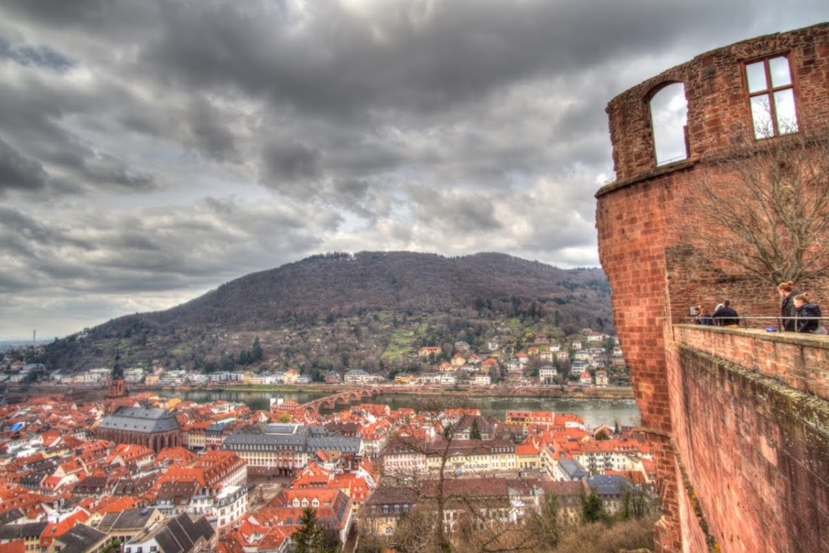 Excellent view over Heidelberg with the Heiligenberg on the north side of the River Neckar, towards Mannheim and the Pfalz. Also a good place to look into the old parts of the Schloss. Access to the Stückgarten is free, so definitely worth a visit.