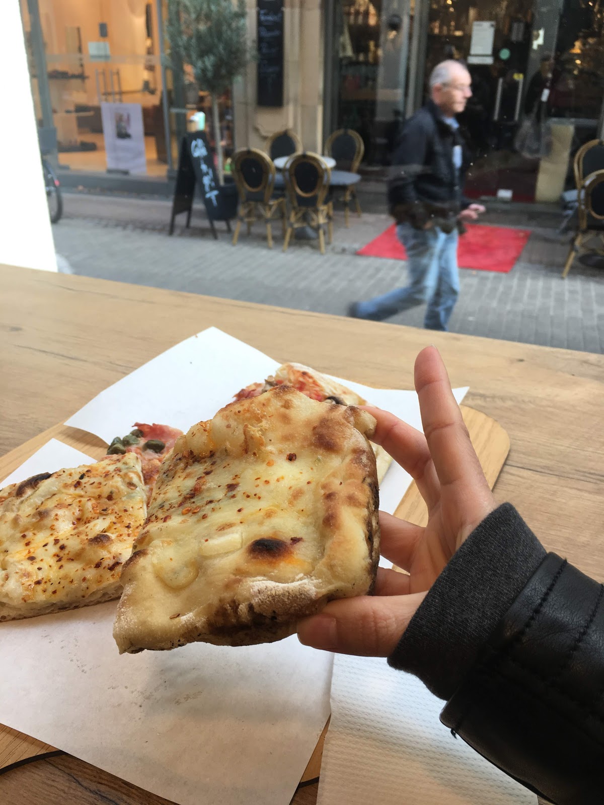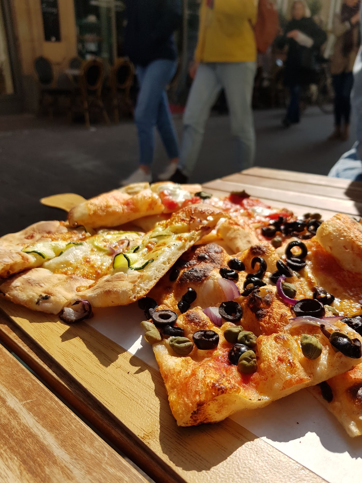 Usually crowded, but today must be a special day. Nestled between decidedly hipster locations selling vegan soups and French pastries, this very fitting restaurant sells pizza slices by weight. We tried a few slices with eggplant, olives, mozzarella...all of them were superb. Seating was limited, but we were lucky and got the table on the street. It was a perfect meal with the sun shining and the kids out on the street.