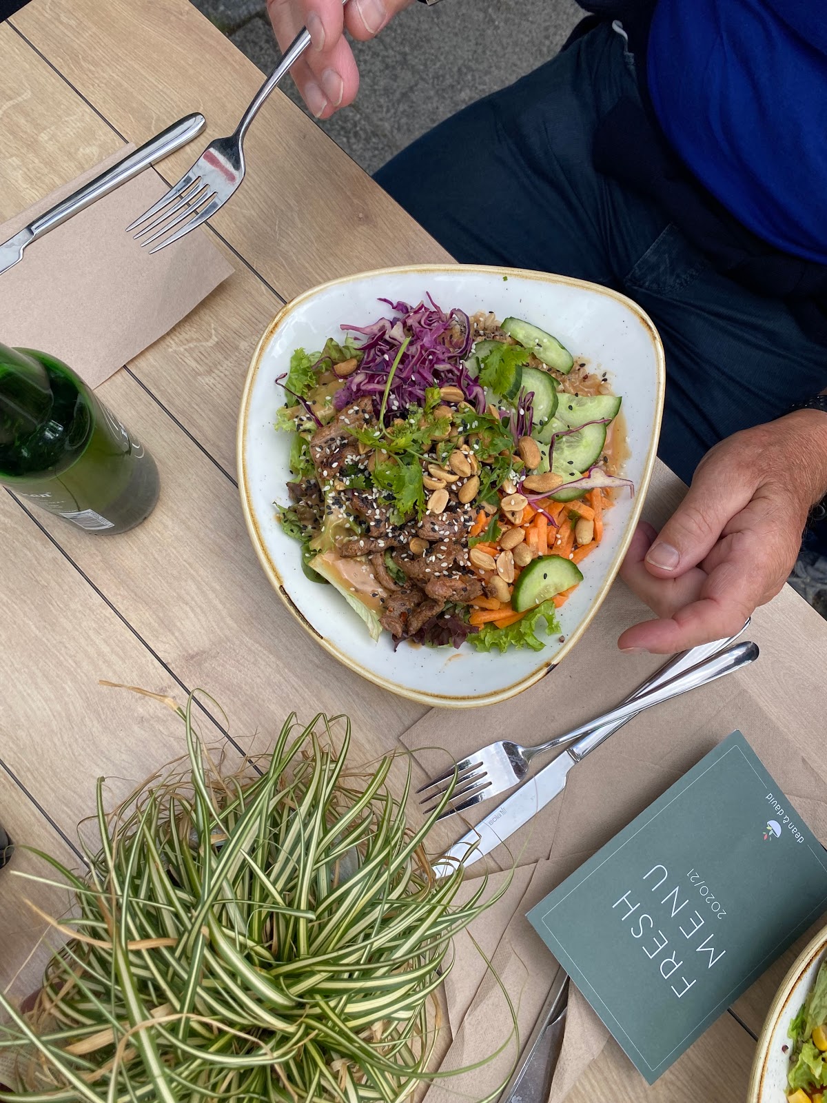 Nice ambience with great service . They serve various healthy food such as salad, quinoa, smoothies and juices. We ordered the yellow Thai curry chicken and green thai curry chicken. The chicken is tender and not too hard. It also comes with a variety of different vegetables. Good value for money for the price. Only downside is that the cafe is a little small and it feels very cramp during peak lunch hours