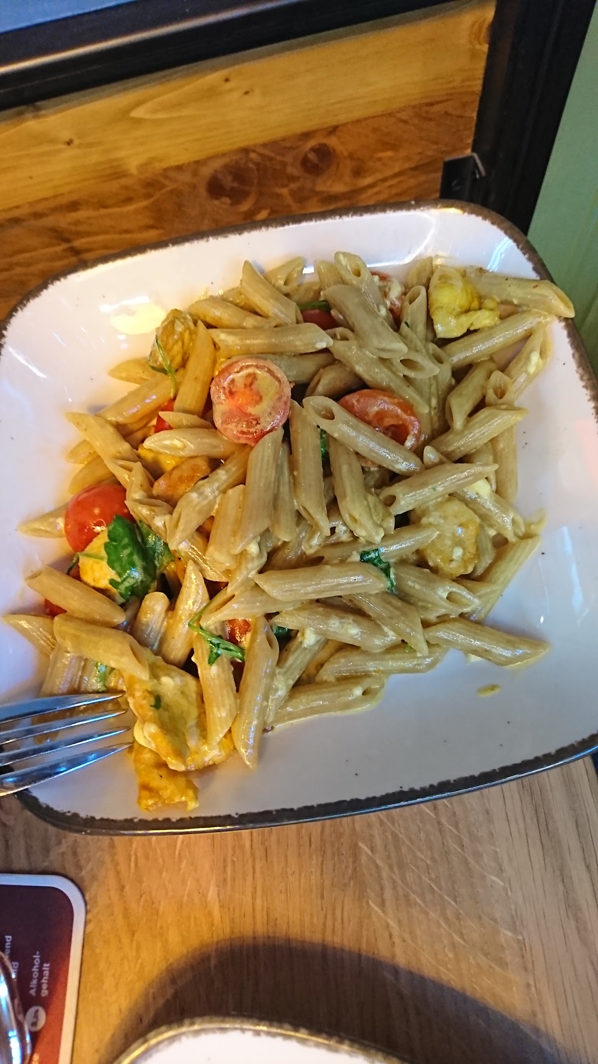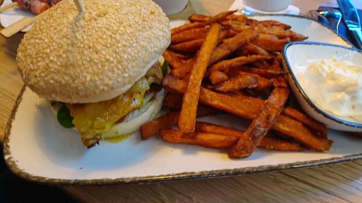 The food was really delicious. For starters, we had figs in bacon, prawns and warm bread with oil and tomato, really good. The main course for the children were the typical nuggets and fries on the table. For us, there was a chicken burger, real meat, no patty, with mango chutney, bacon and sweet potato fritters sauce, and a tomato and herb pasta with cheese sauce. And that was really good!