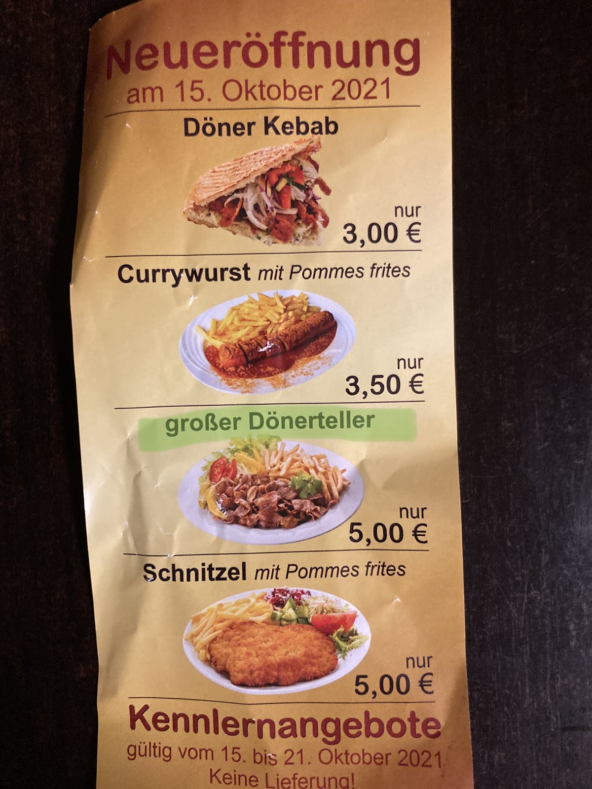 Heute 18.11.21 das erste Mal telefonisch einen Dürüm bestellt,hat alles super geklappt.Beim abholen sehr netter Herr ich würde da jederzeit wieder was bestellen ☺️