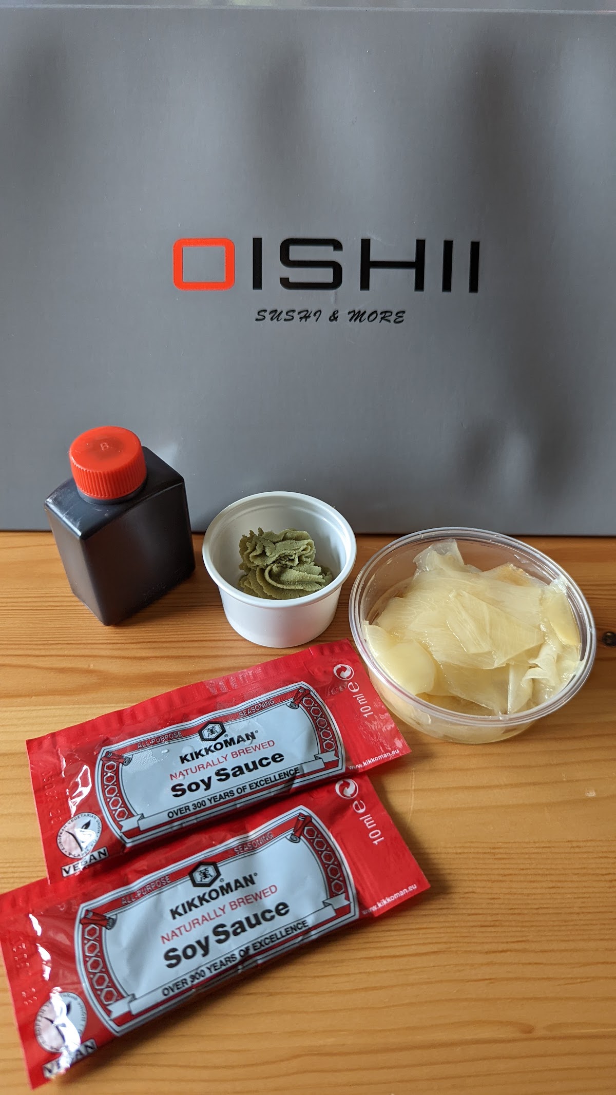 The sushi came in a sturdy cardboard box with chopsticks, ginger, wasabi paste and soy sauce.