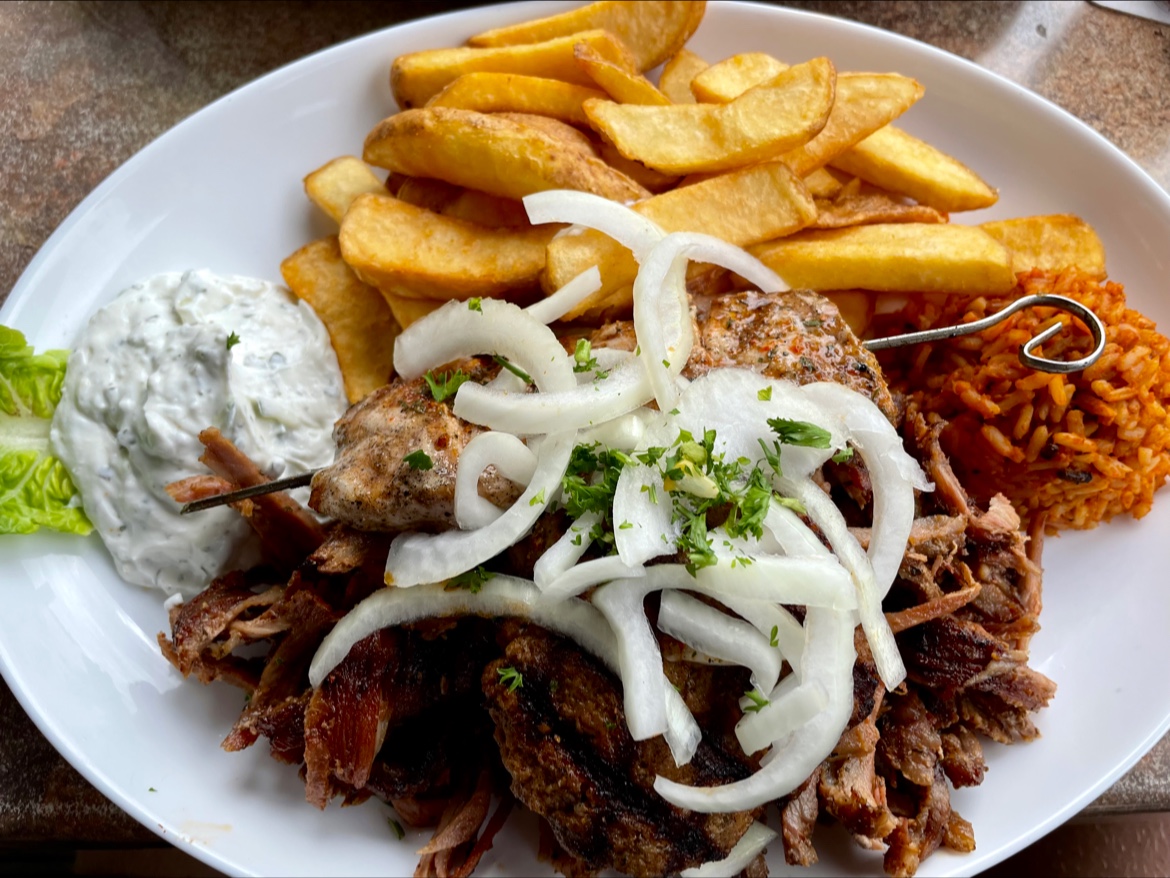 Essen ganz ok und freundliches Personal. Kalte Vorspeise sehr groß, wenn auch mit viel Gemüse „aufgefüllt“. Auch die Grillteller sind mehr als üppig. Zaziki dürfte mehr Knoblauch haben, schmeckte etwas „lasch“ ;)