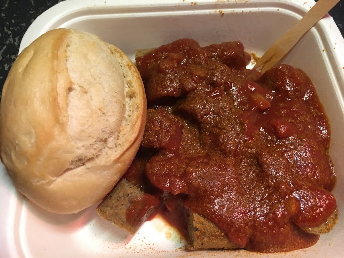 A lot of meat and also some vegan burger. It's okay here. The building has been a toilet cabin before. :) The vagen "Currywurst" was better than expected.