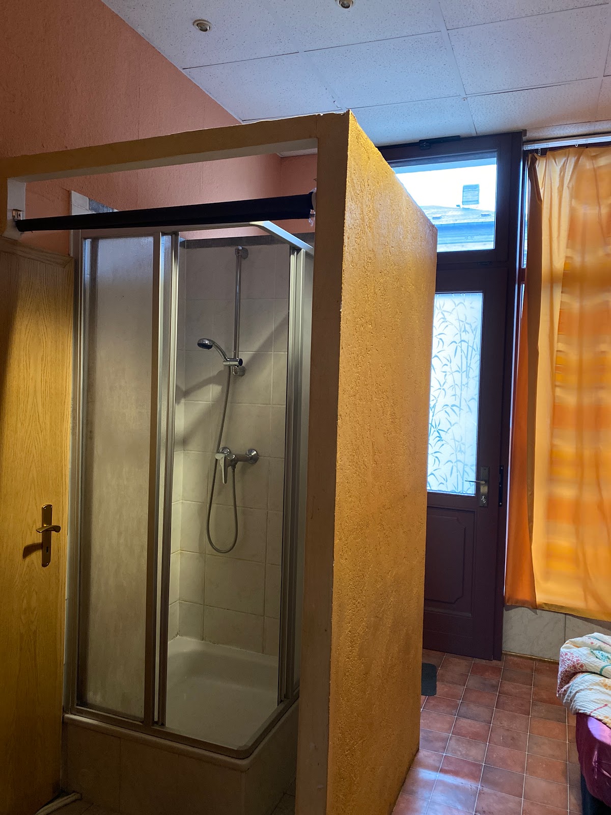 Dusche ist mitten im Zimmer und ist nicht abgetrennt!