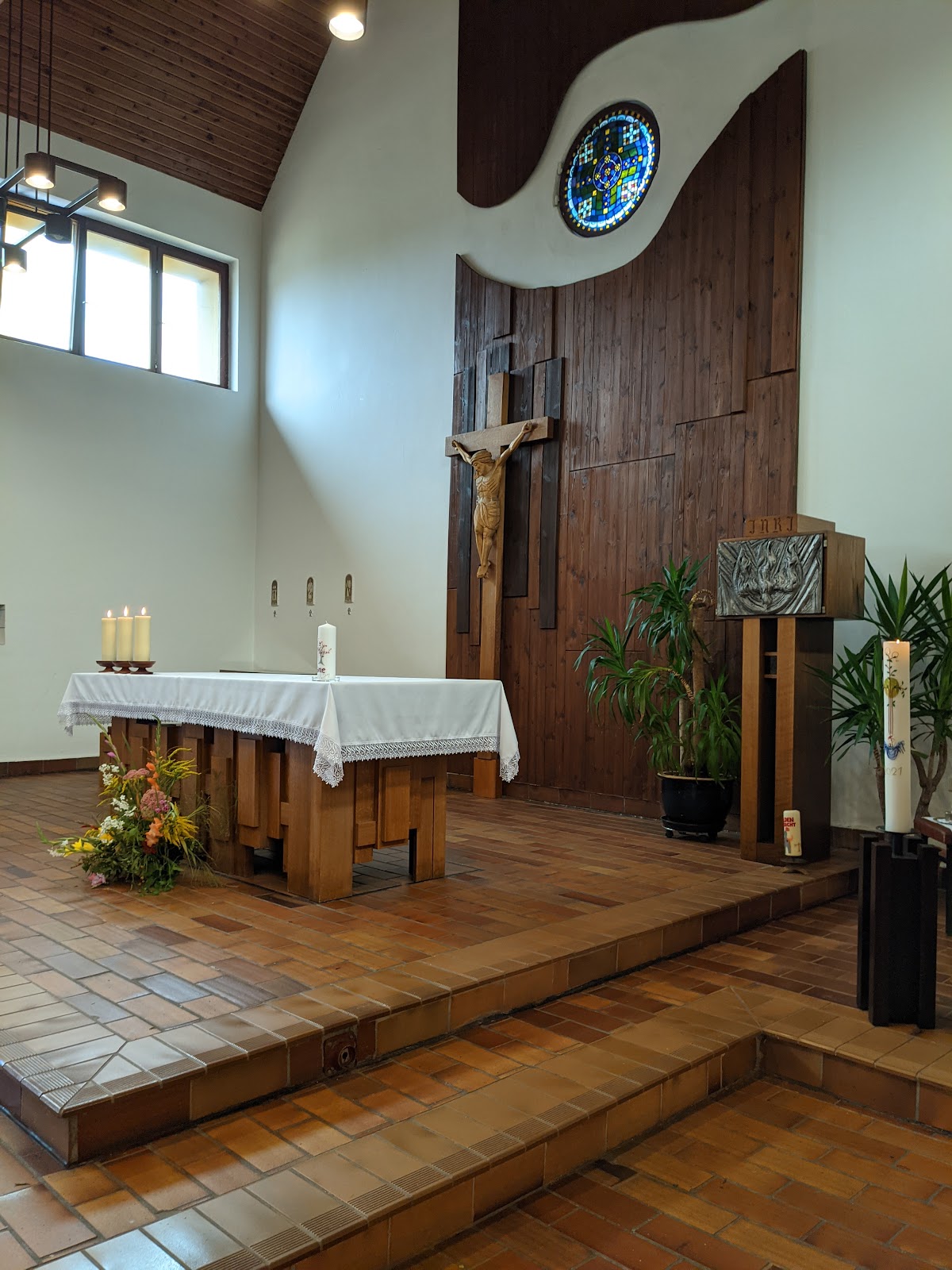 In 1885 there were already plans for a parish in the north of Leipzig. But it wasn't until 1906 that the present-day estate "Platz des 20. Juli 1944" was purchased. Architect Lohmer designed the plans for the school, church and rectory. The school was completed in 1911 and the room attached to the gymnasium was used as a chapel. During inflation, construction of the church began in 1922. Its artistic design determined the memories of academics in Germany who died in the First World War. Especially worth seeing: the Stations of the Cross, the Pieta and the wood-carved nativity scene. The altar was painted by a French POW soldier. It was housed in a chapel used by the Jesuits until 1994.