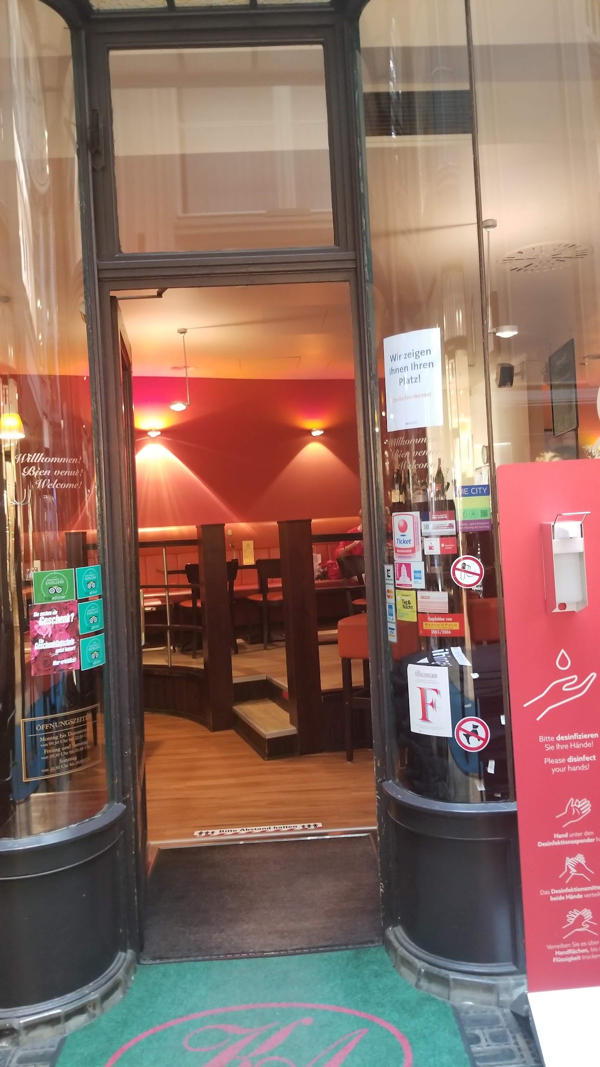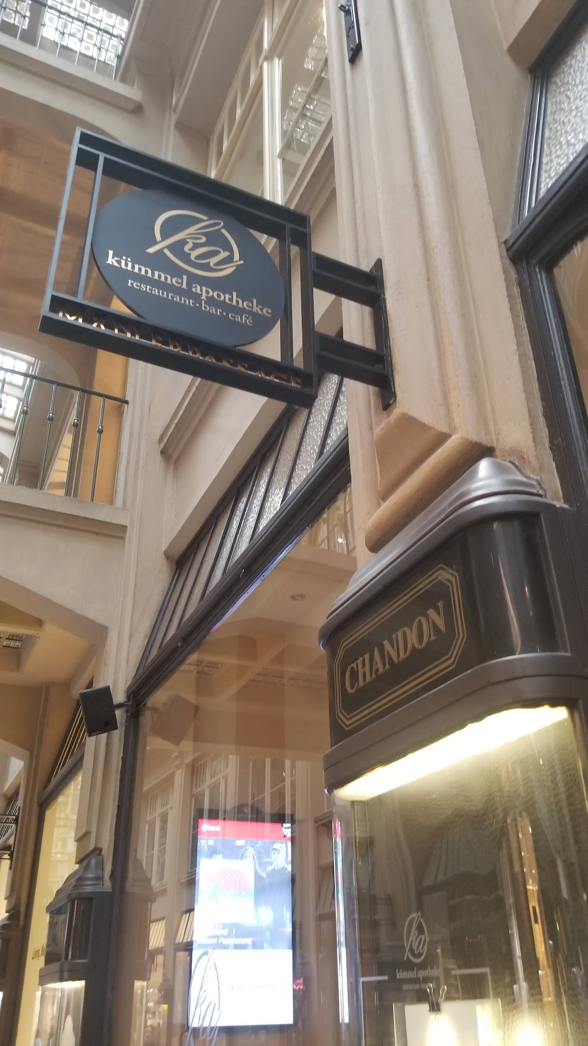 I ate a late lunch here before running in the Leipzer Nachtlauf 10K. Nothing was appropriate as prerace food -- basically everything was greasy, covered in cheese, smothered in cream sauce, etc. The Michelin guide says that you can order a "light meal" here, but I don't think that is the case. The food itself tasted fine. As far as the decor goes, Mädlerpassage is just not impressive. We sat "outside" in the arcade, but there really wasn't anything nice to look at. You may as well be eating in a food court at an average American shopping mall.