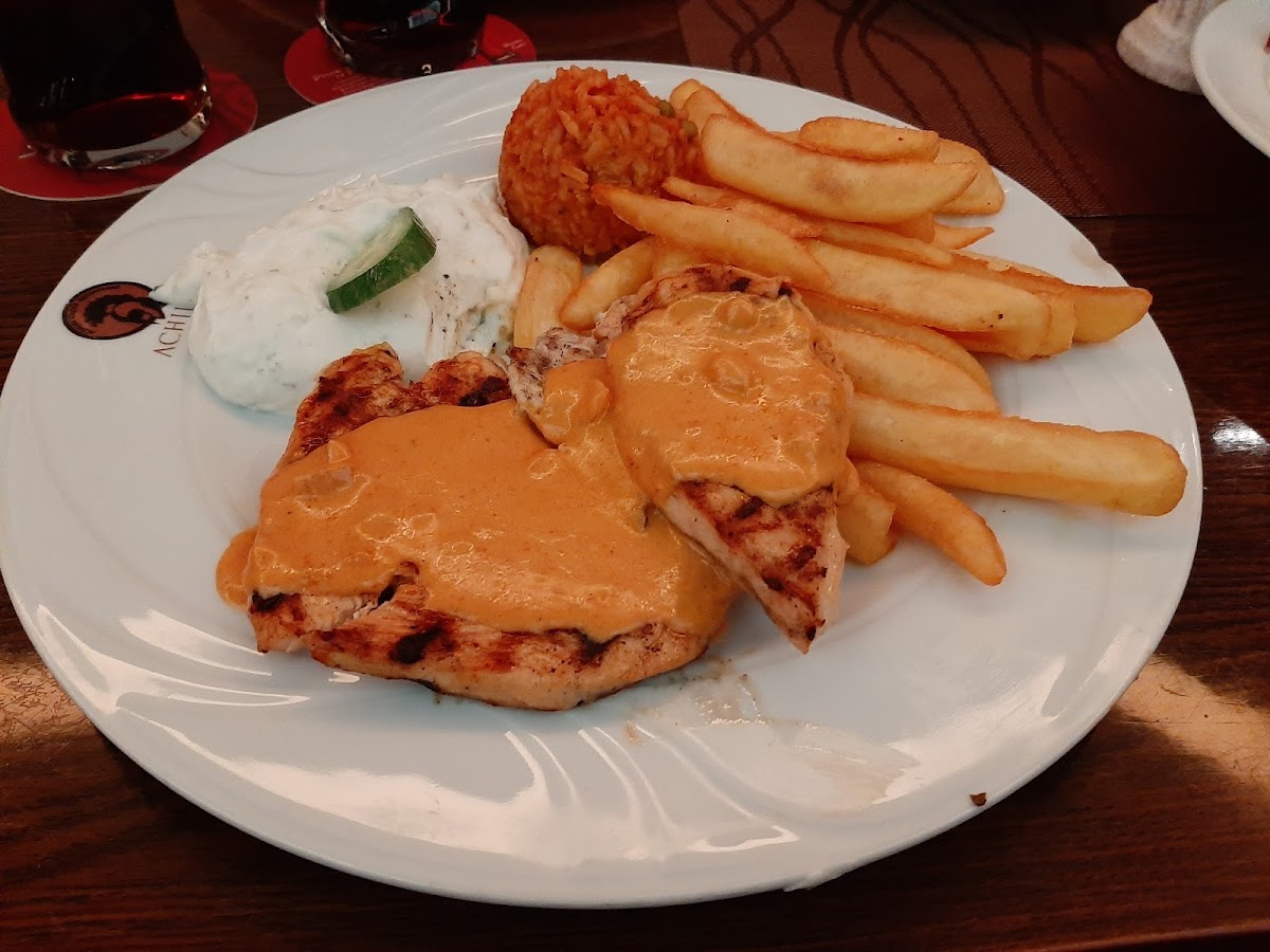 Obwohl die Portionen unglaublich groß sind, ist das Essen qualitativ gut, das Gyros ist hervorragend.
