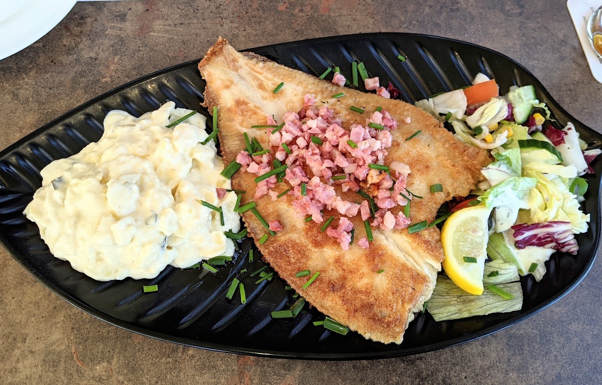 Located in the Old Vogtei, in historic waterfront of Travemuende, with plenty of outdoor and indoor dining. Great food, local maritime cuisine, we had the whole flounder, one regular, the other "Finkenwerder Art" (with bacon pieces), both with side salad and generous potato salad. Both were fresh and tasty and perfectly cooked enabling easy bone removal. Plenty of beer and other alcoholic drink choices and attentive service. Desert choice was creme brulee, which spared no we expense: real vanilla cream, large glass container.