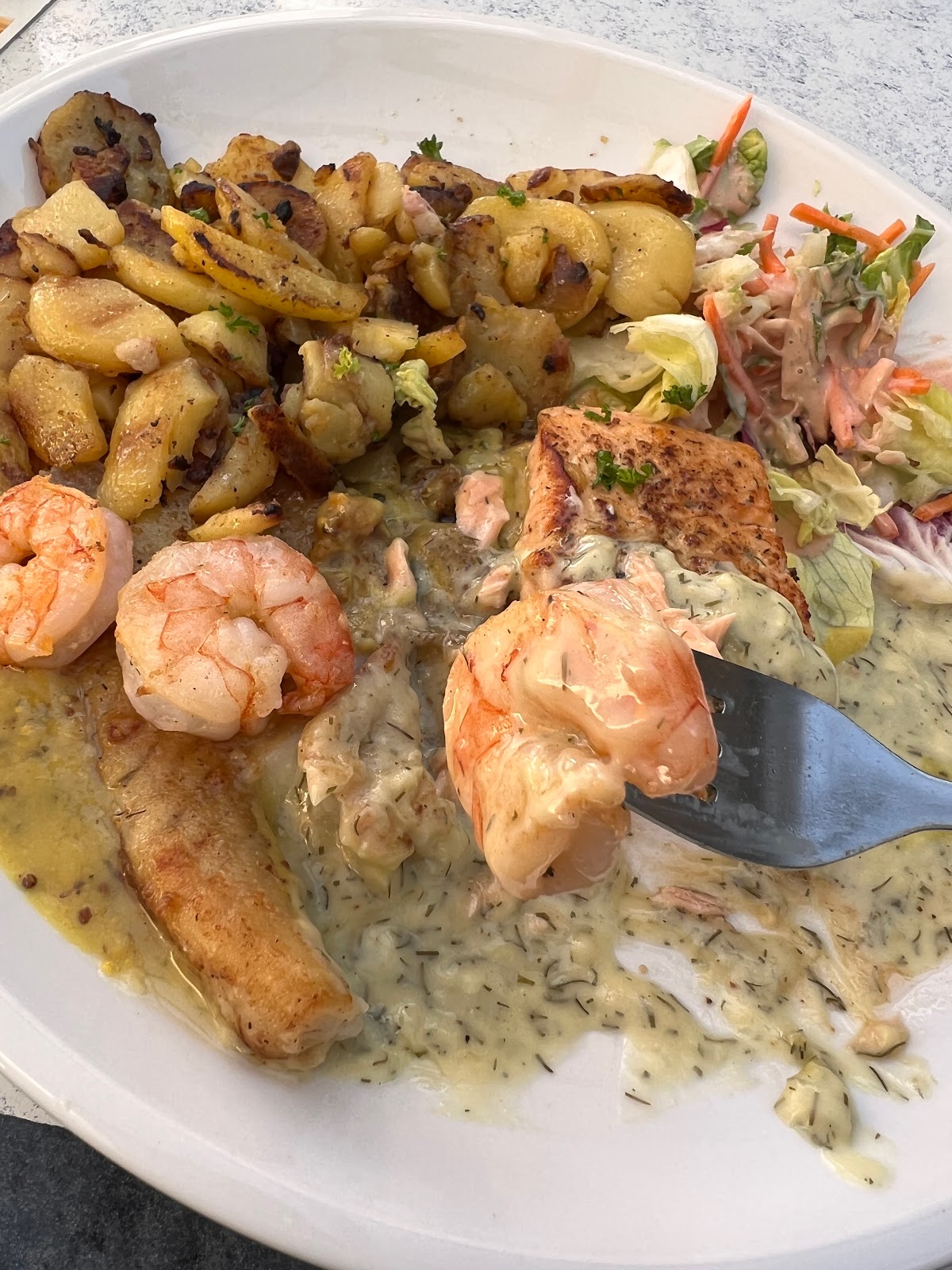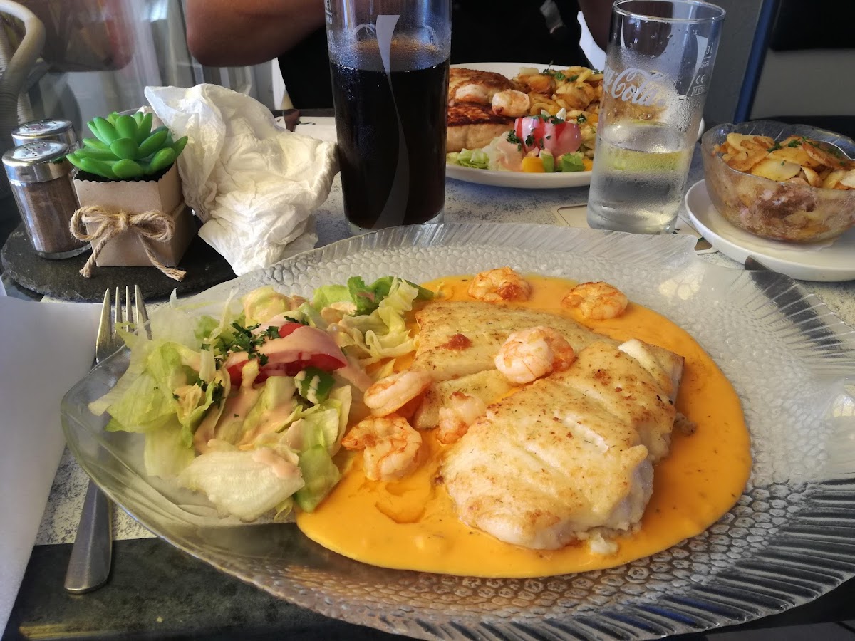 Fresh fish, good service. Our food was great and they give a nice pour on a glass of wine. Looks like just a fish brotchen place from the outside but it’s not and there is a bunch of seating inside.
