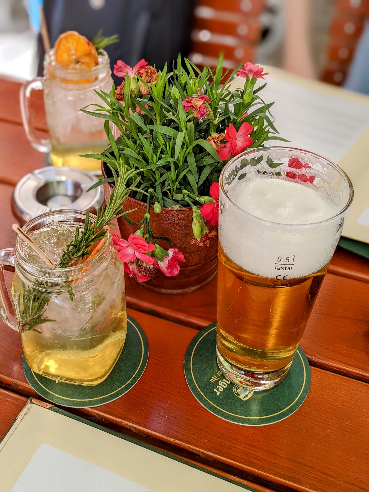 We were lucky enough to have lunch here on a beautiful sunny day so we had a table outside. The restaurant was really busy and it seemed like they only had about two waiters serving all the outdoor tables. It took a long time to get our food. We had the asparagus soup, the schnitzel, and crispy roast pork. The beer was excellent! Overall a very nice meal in the Marienplatz and a much better atmosphere than the popular restaurant across the street.