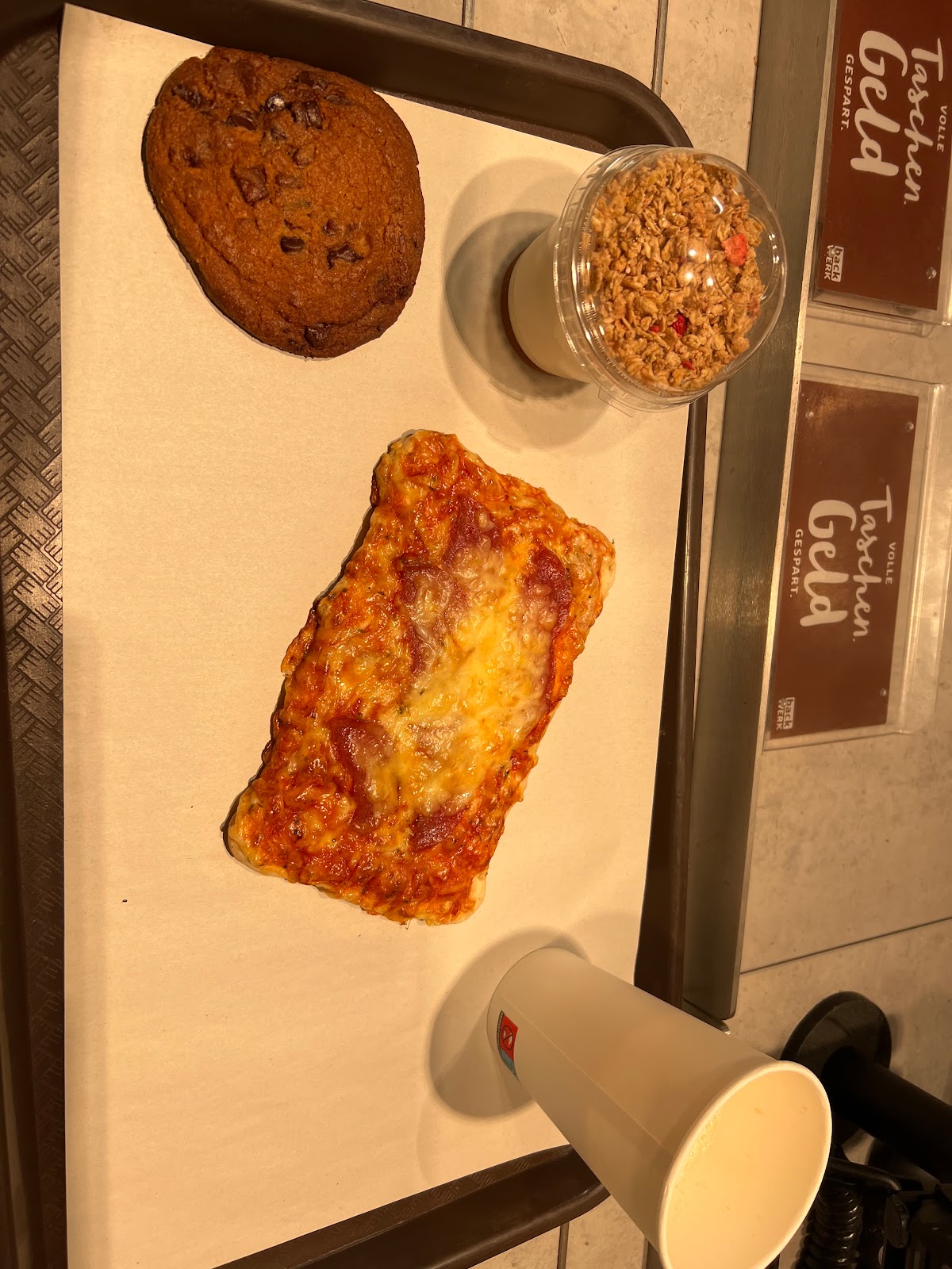 Solid meeting place for work. This order costs 9.40 euros for a cookie , parfait, pizza and a coffee. Dont expect amazing quality but its workable