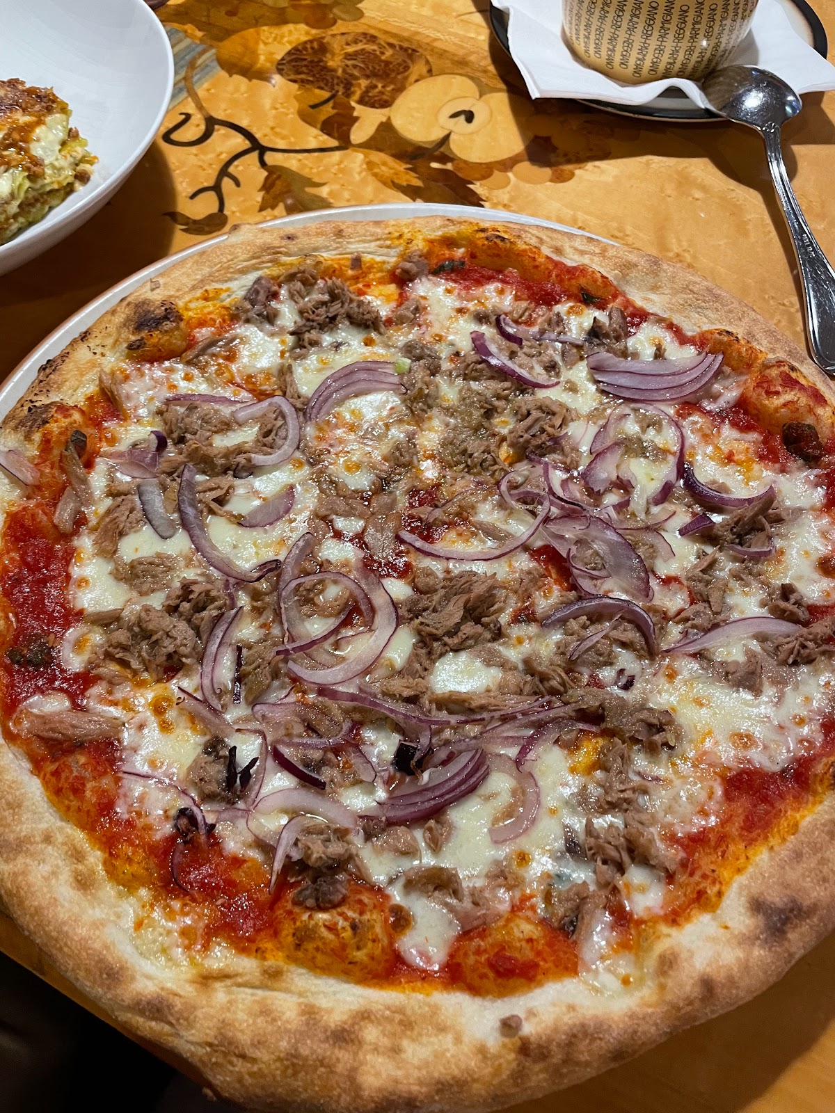 We ordered the beef lasagna, tomato soup and pizza with salami.