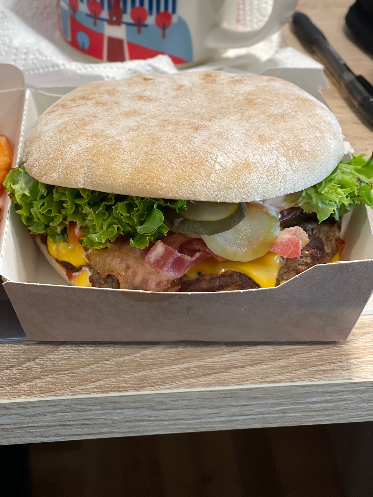 So I got the gourmet Angus cheddar burger, added bacon and aioli. I’m American, I love burgers. For my fellow Americans, don’t order bacon, it’s just a slightly fried or baked thin slice of ham. ????