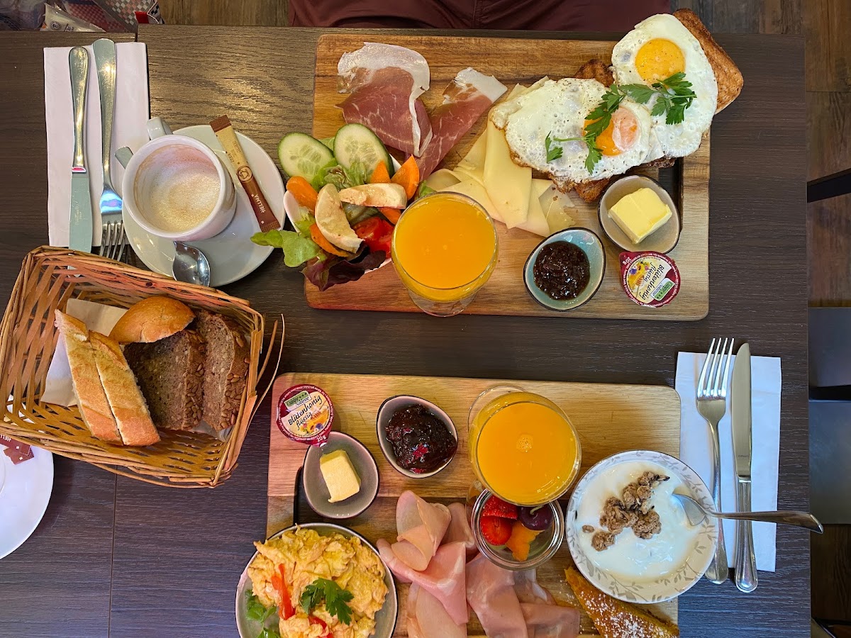 The yogurt and smoothie each have a great mix of assorted fruits. The bread is delicious. Server was very friendly. I thought the scrambled eggs were okay, a bit overcooked. Wife's fried eggs looked better. Would love to come back next time I'm in Munich.