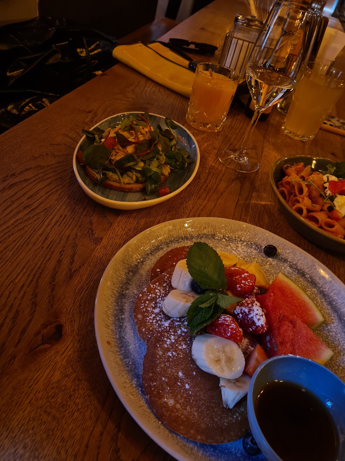 the restaurant/cafe is very cozy with modern interior and a great selection of breakfast items, cakes, coffee, burgers, bowls, drinks and salads at average munich prices and with really good vegetarian and vegan options. however, the menus themselves come cheaply laminated and frayed on clipboards, the tables aren't properly cleaned between customers, there is a long queue outside the door in the cold prior to getting a table and, this is the thing I genuinely need to criticize: the whole place is crammed, really loud and way too close to all the other mask-less sitting customers. yes, they check whether you're vaccinated against covid at the door, but that doesn't eradicate the possibility of being infected. and inside this restaurant, you start to doubt the existence of a global pandemic. it's WAY TOO full. no wonder case numbers are still this high. the food and drinks we had were honestly good and their young staff very friendly, but this is a deal-breaker for me. they should really reduce capacity. if we'd known it would be so crowded, we wouldn't have come, but it's not visible from outside due to all the plants in front of the closed windows. also, the restroom was really dirty during our visit (with a lit scented candle underneath the sink on the floor which is an odd way to combat smells in a bathroom).