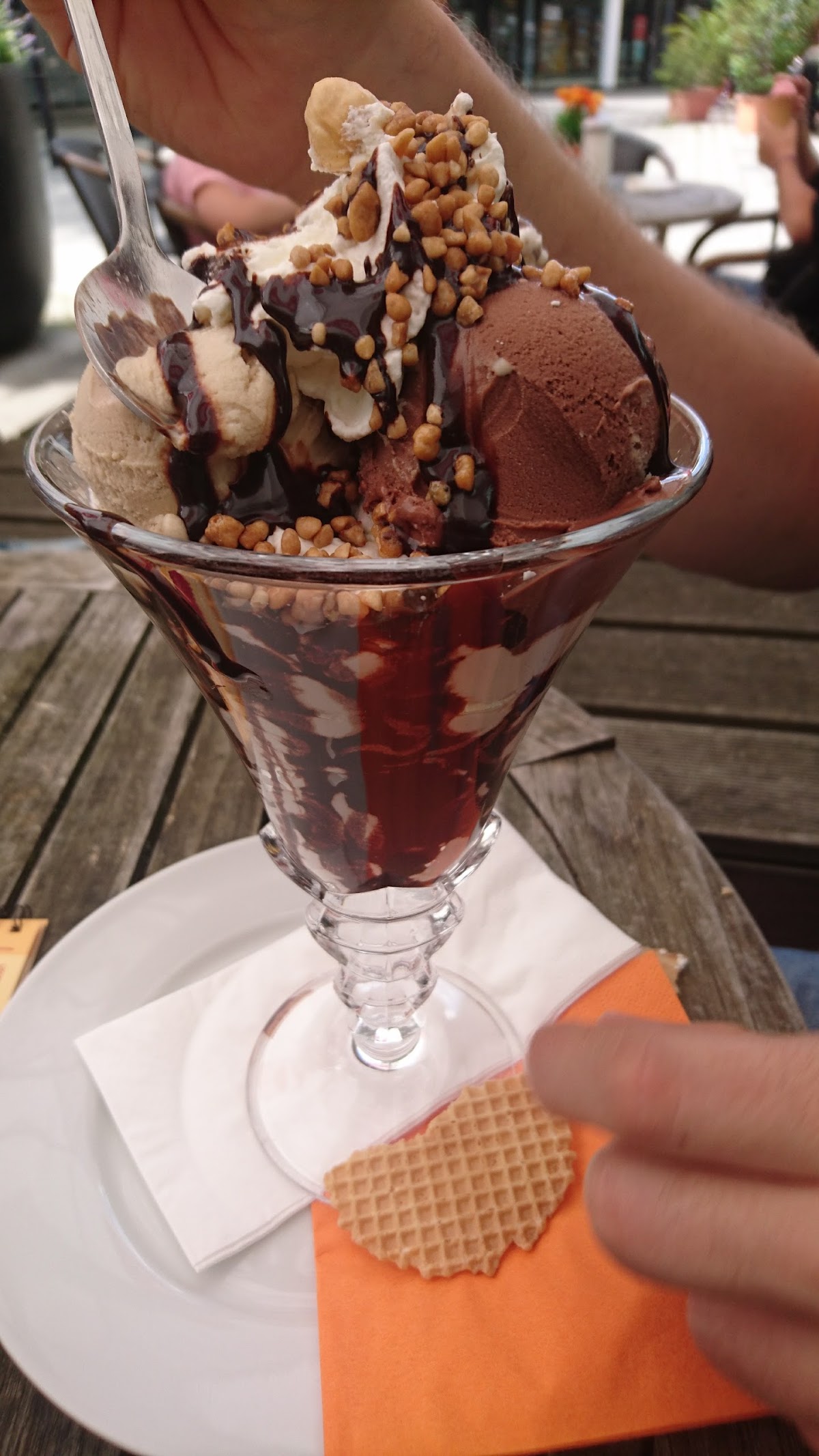 The food is good and the location is nice in a small open mall. The reason I give only 3 stars is more about the service. Once I ordered some lemon ice cream and got yoghurt. Another time I ate there and about 4 different waiters were standing around, while we waited pretty long until we were able to order. Although everything was ordered at the same time, the food came not all at once. I had eaten half of it already as the food of my companions arrived. Also I was offered some spicy sauce, which never arrived at our table.