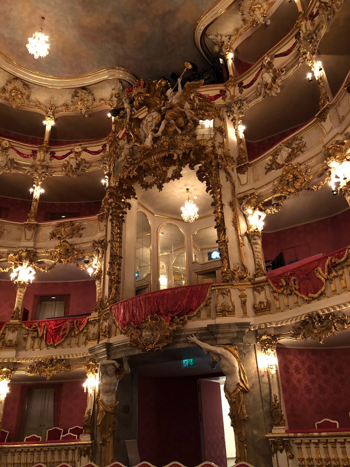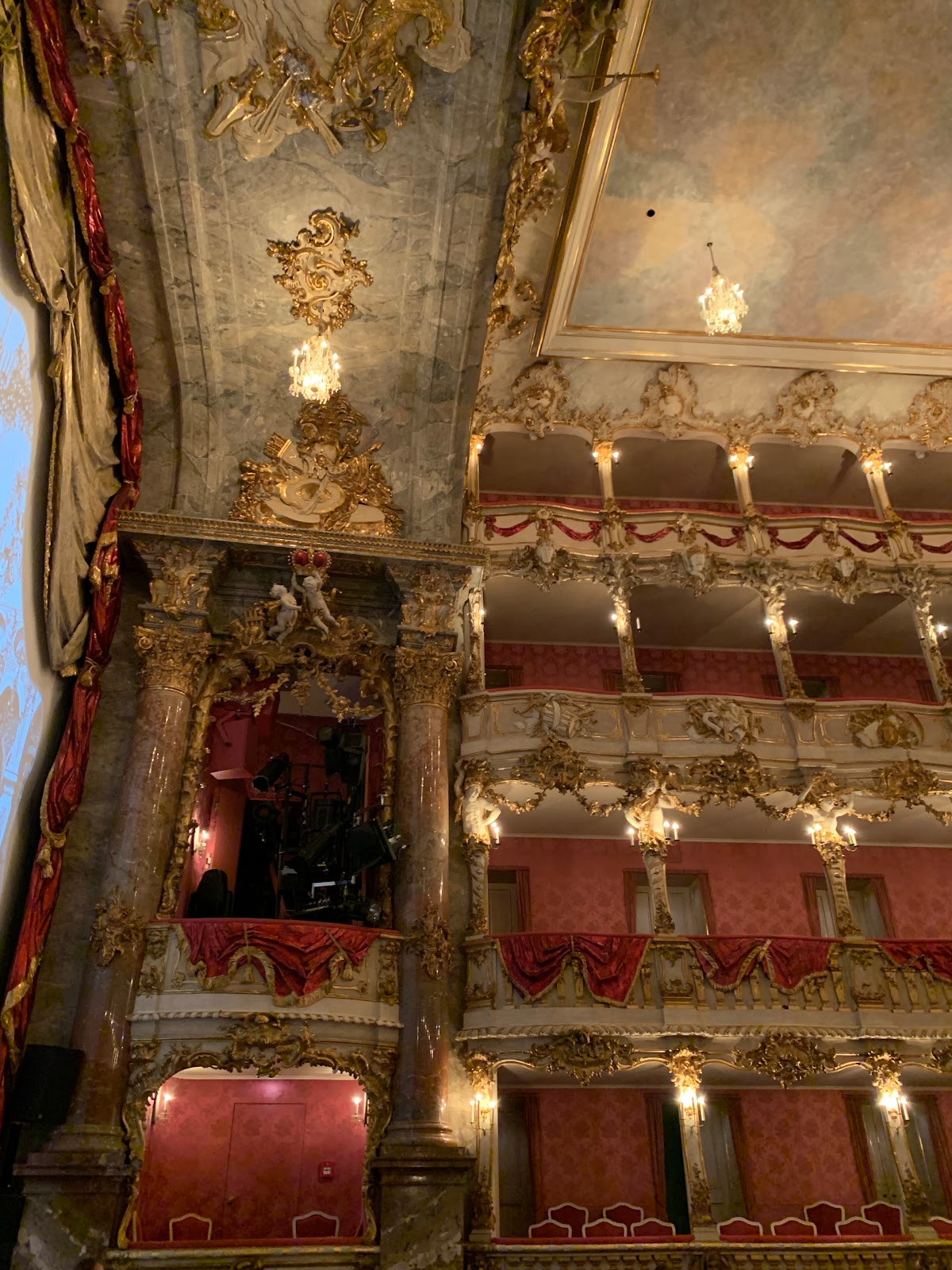 Sadly, the original theatre was badly damaged during WWII and had to be rebuilt. What you see today is suppose to be a meticulous recreation, making use of the delicately carved and gilded boxes from the original theatre. It is very beautiful and easy to enjoy.
