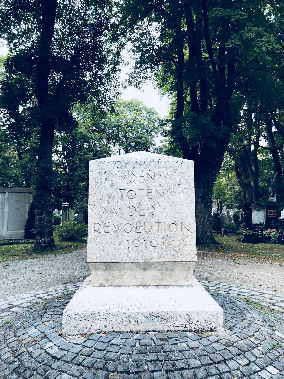 Denkmal für die Toten der Revolution von 1919, gemeint sind insbesondere die Opfer der Niederschlagung der Räterepublik. Im Sockel des 1922 errichteten Denkmals war ursprünglich die Urne von Kurt Eisner beigesetzt, der am 8. November 1918 nach einer Demonstration die Republik ausrief und erster bayerischer Ministerpräsident wurde, ehe ihn 1919 Anton Graf Arco erschoss. Das Denkmal wurde 1933 zerstört, Eisners Urne im Neuen Israelitischen Friedhof beigesetzt. 1955 wieder errichtet, 1998 wurde auch wieder der Spruch von Ernst Toller ergänzt. Heute zugleich Denkmal für die Opfer des Widerstands.