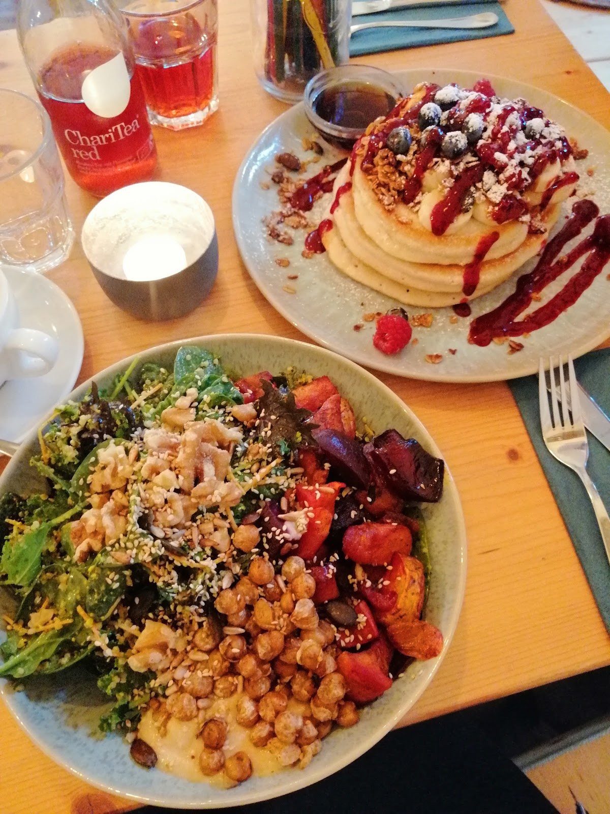 hard to find and quite small, but worth it. the prices seem high, but they're appropriate considering the portions we were served. their staff is very friendly and young, there are pencils and coloring books for kids, everything is vegan and you can watch the cooks prepare your meal in the open kitchen behind the counter. however, the thick pancakes were still doughy in some bits, the bowl lacked spices and the bathroom downstairs was dirty, so while I would recommend the place and plan on trying more of their menu items in the future, there is still room for improvement. and a small info on the side: this location is only open until 5pm and their kitchen closes an hour before that, so make sure you don't come by too late. and try the cinnamon buns- they're amazing.