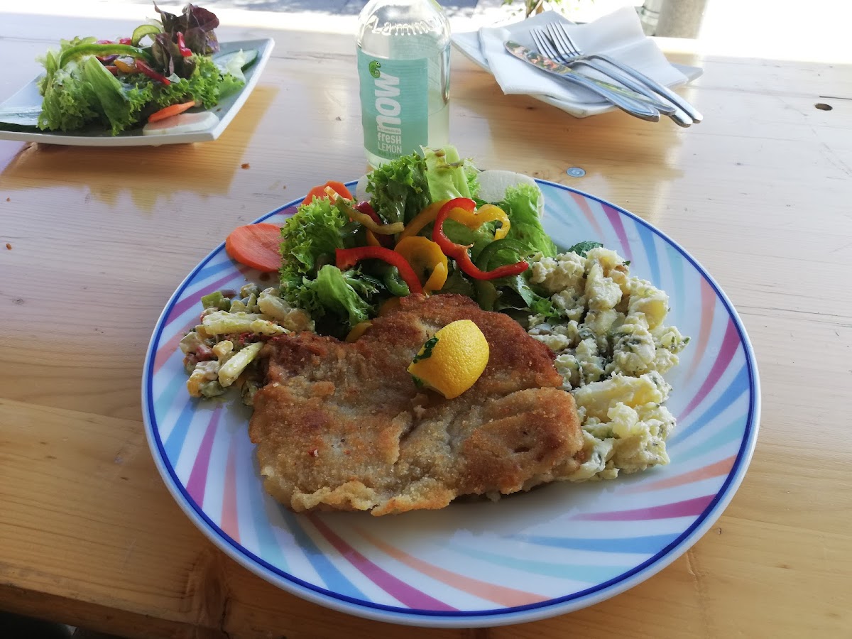 Huge sized schnitzel (vegan schnitzel) pasta salad and potatoe salad are great. Recommend the lasagna ???? GREAT veterinarian food!!