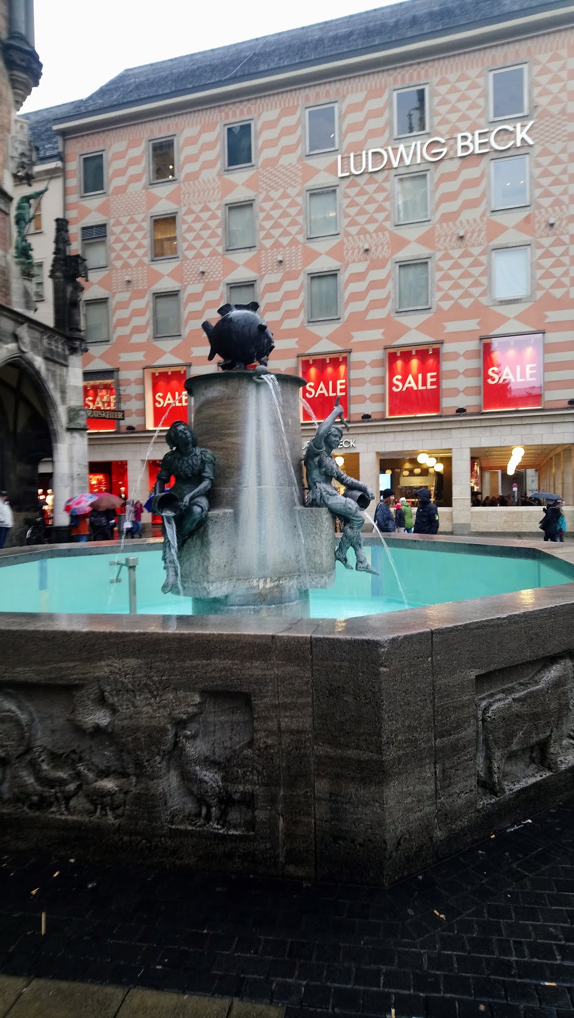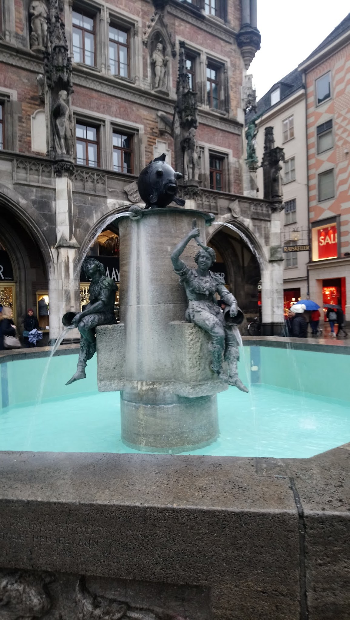 Good meeting point in Marienplatz. Funny looking statue of a fish on top and butchers with buckets below.
