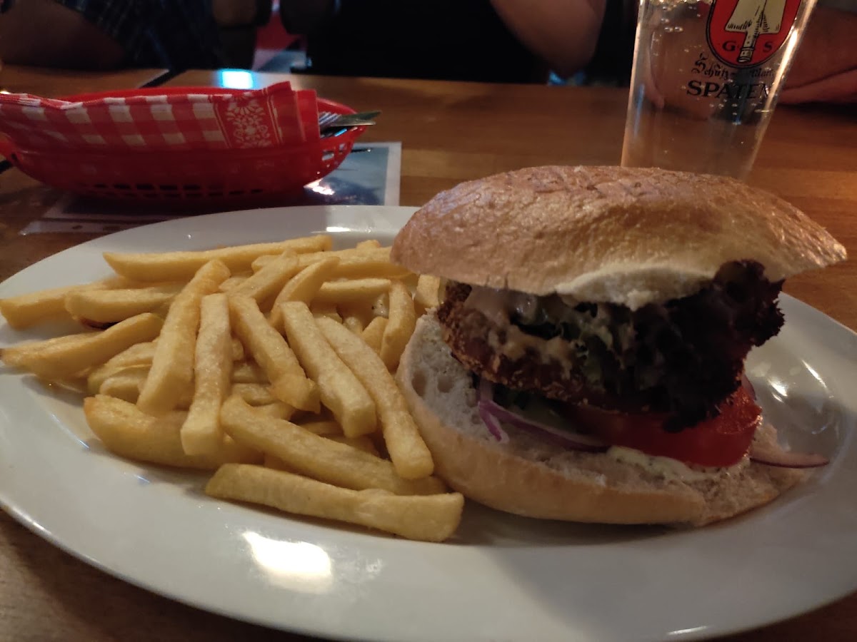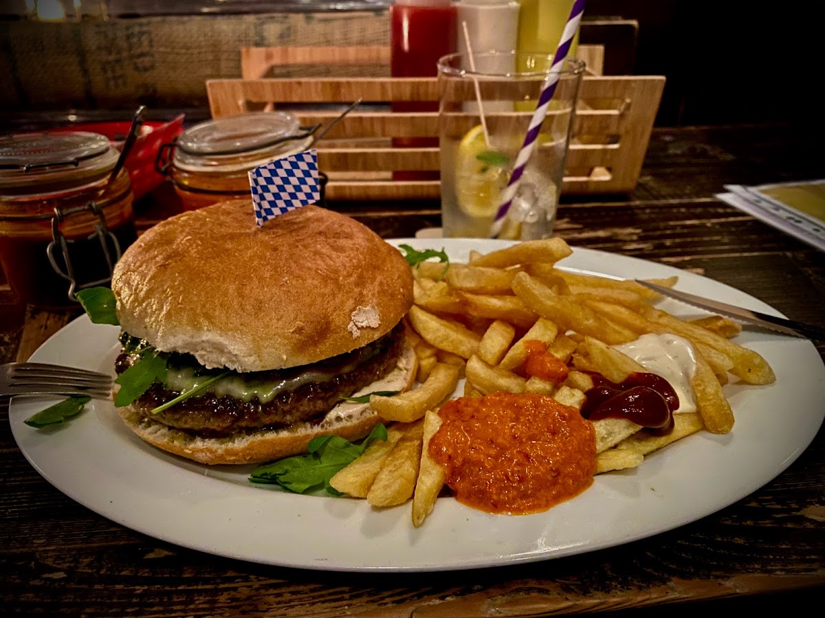 I loved the environment and the burgers are great, you can either eat them with salad or fries. Frida burger and Vegan burger are same price 11.20€ and Beer are around 4.20€. They have a lot of cocktail options. The toilet is clean. The waiters are kind and nice. They have easily handled our 15 people group :)