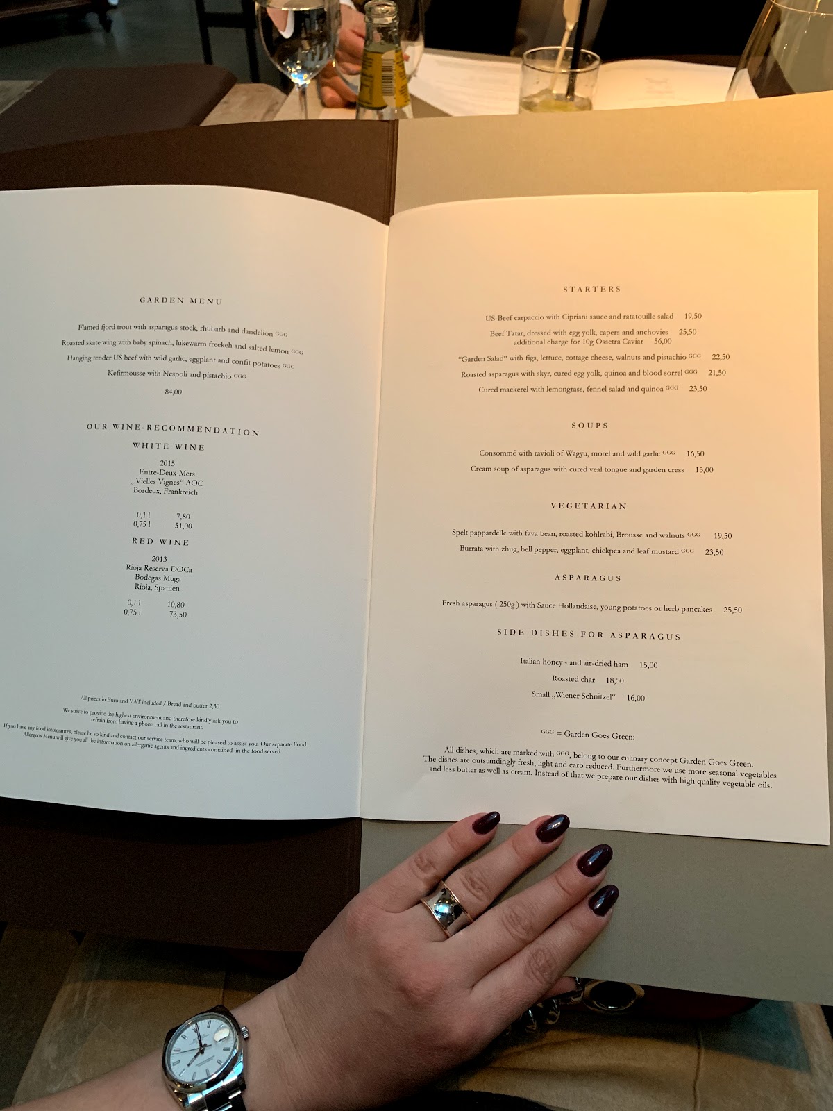 We ordered our starters and the mains. Bread and butter was put on the table. The table next to us ordered after us and what a surprise, while we still waited for our main course they had finished their two course dinner, had coffee, paid and left. And we kept waiting for our mains. During all this time, many service people hovered around but it seems the kitchen was understaffed. The food was OK, however when I saw the main dish - Lamb - I was somewhat surprised as nobody at our table was on a diet. Coffee was served but the bill again took its time to arrive. When going through it, we were taken aback to be charged for bread and butter with € 2.30 per head. I have never been asked to pay for this in Germany. This is the more surprising as the prices are rather steep; in Italy it is another case but there they call it "coperto" and usually the tables are white covered. At the garden a wooden table with individual table mats.