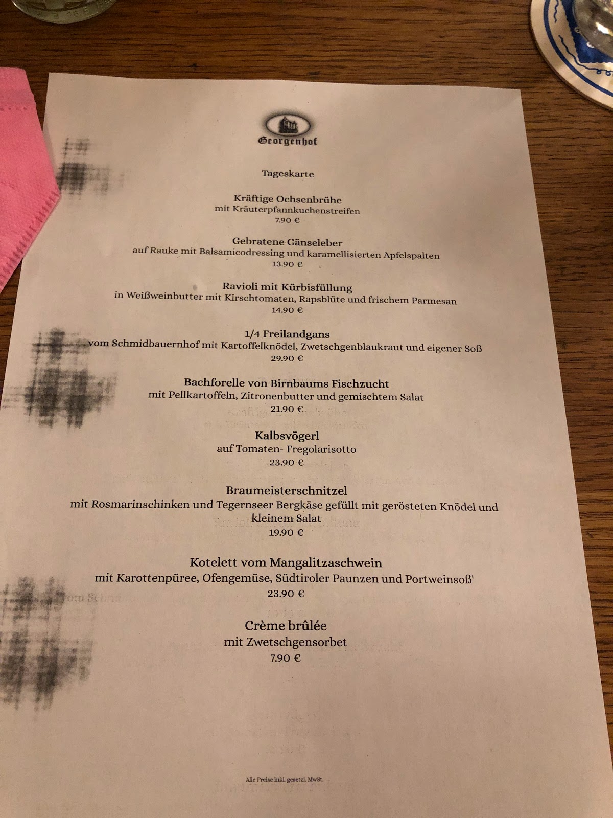 After threatening us that she would "call the manager" to speak to us, she managed to remove the dish from the bill after talking with the manager herself. Long story short, I got food poisoning the day after the dinner at Georgenhof. This was a really disappointing experience in what used to be a nice Bavarian restaurant. Definitely our last visit!