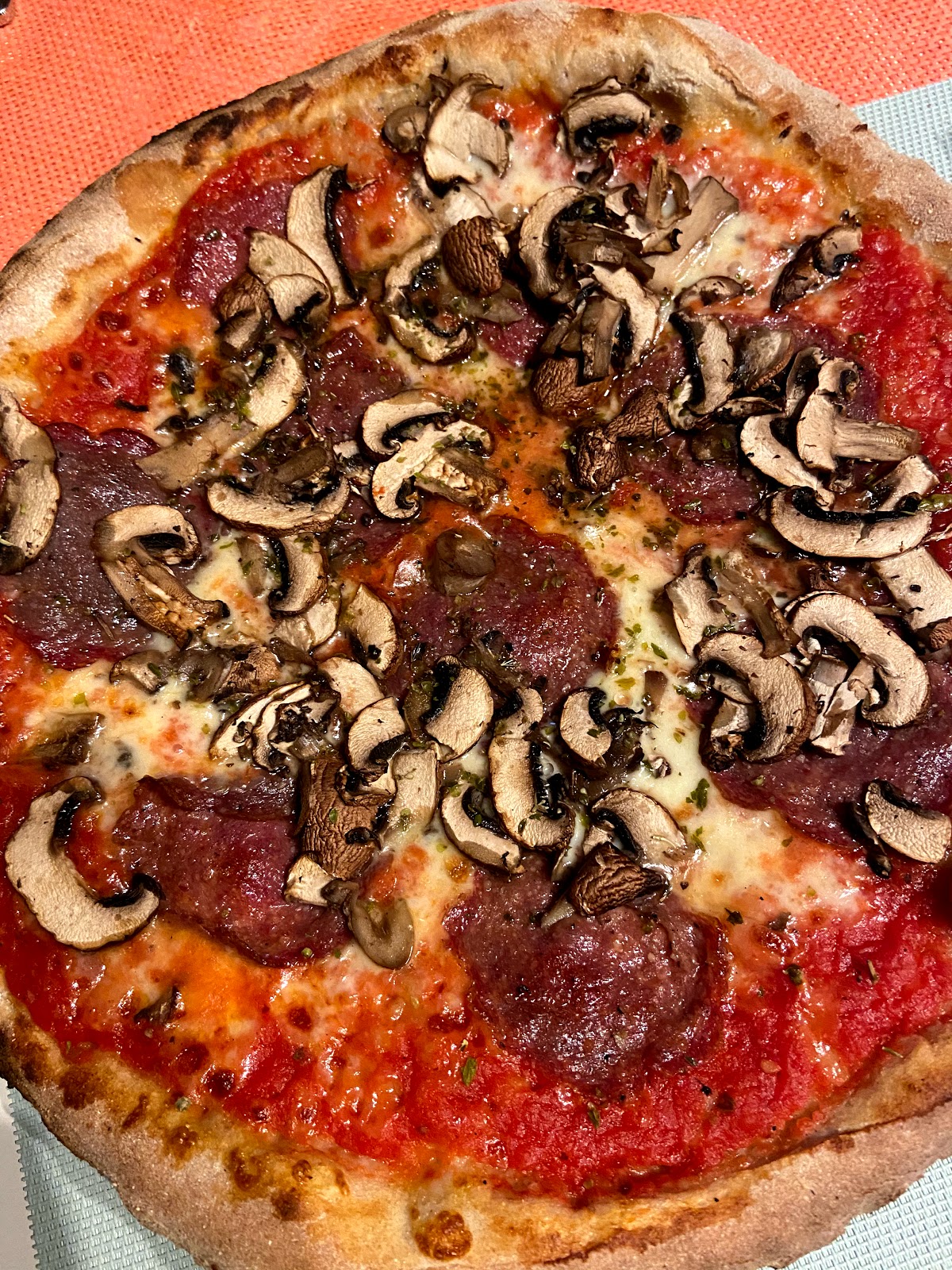 Just love the sensation of pizza prepared in a fire brick oven with all natural delicious ingredients. The crunchiness of the crust to mozzarella to juicy ham and mushrooms covering a zesty tomato sauce with basil.... just mouth watering...