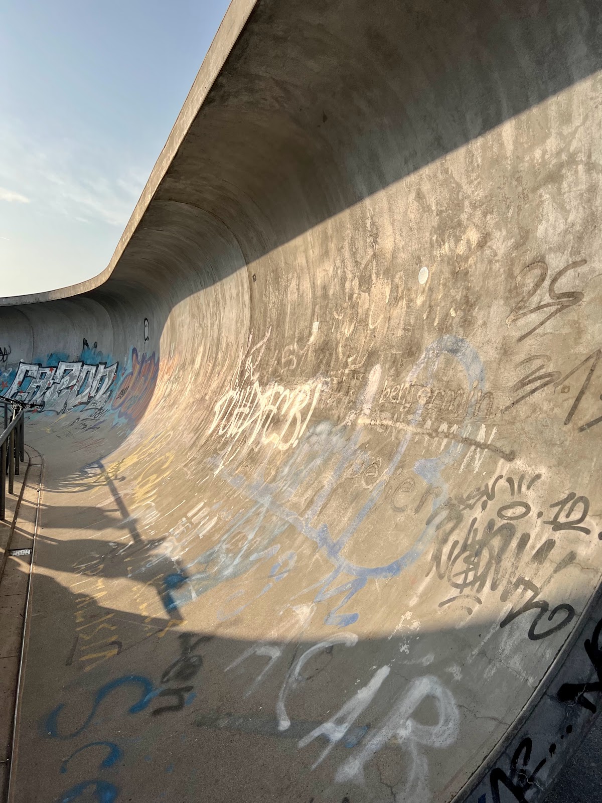 We have been here for some hours with #Bigfoot u0026 #Littlefeet. Especially for #Bigfoot it’s a great pipe for riding his scooter. Some folks went through it with skateboards. And compared to other tub’s it’s huge and fast. And they have a grandstand in direction of the evening sun so that everybody can have a beer or two. The best way to go there by car? Drive to the bridge instead of the bridge with the famous club. If you wanna ride your scooter, skateboard or BMX in more professional surroundings this place is the best! We recommend it! And #Biggoot asked me afterwards when we will come back here ????