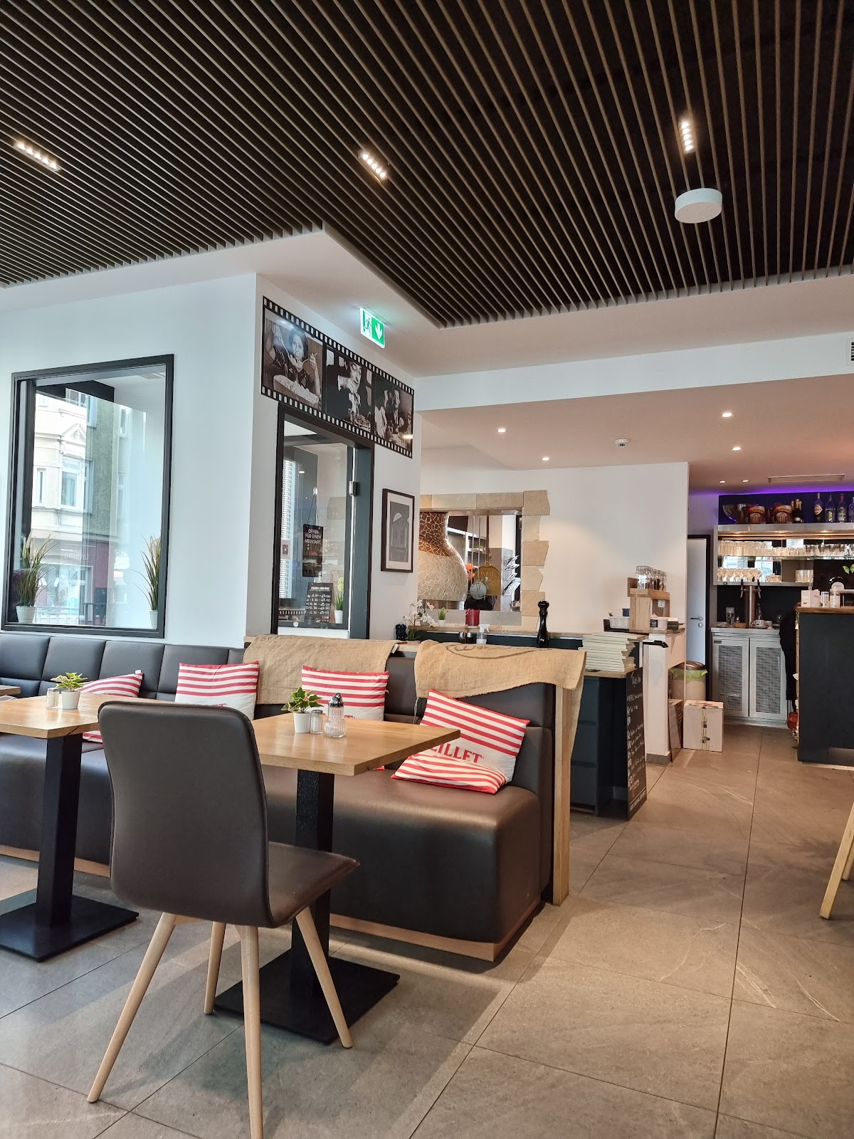 They had redone the restaurant it seems, and new (and horribly cheap) tables were installed. I waited for a Latté Macchiato and when it came, my foot caught the base of the table. In most restaurants, this would not be a problem. Here, the table was so light and flimsy that it slid across the floor and my Latte went EVERYWHERE!!!! The waitress was clearly aware of this, yet minutes passed and she was nowhere to be found. I was utterly embarrassed and began to clean up the mess myself. They had no real supplies to do this, so I grabbed a towel off of a counter and used it to clean up the floor so that people could walk and not slip and fall. I also used all of the cheap, small paper napkins I could find and fully cleaned up the mess. At NO TIME did anyone offer to help.