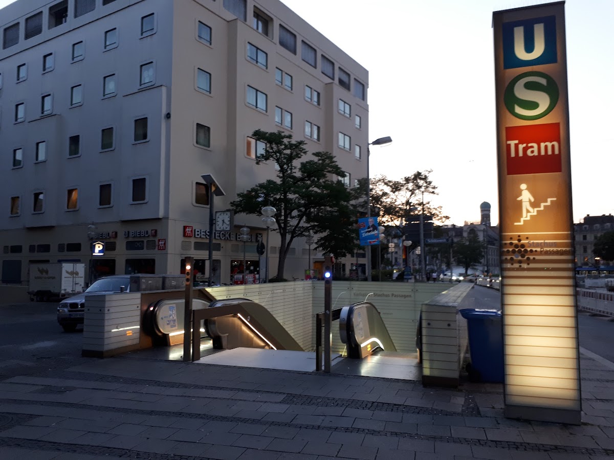 Die Münchner Haltestelle Karlsplatz wird meist Stachus genannt, hier gab es früher eine Kneipe von Eustachius Föderl, der Name blieb allein. Hier treffen sich unterirdisch die U4 und U5, oberirdisch ein ganzes Netz von Trambahnen, deren Aufgänge im Untergeschoss jeweils bei den Treppen und Rolltreppen vermerkt sind. Zugleich ist hier ein großes Einkaufszentrum. Für Zugereiste nicht ganz einfach! Hier beginnt die Fußgänger-Zone mit der Kaufingerstraße (meine Skizze).