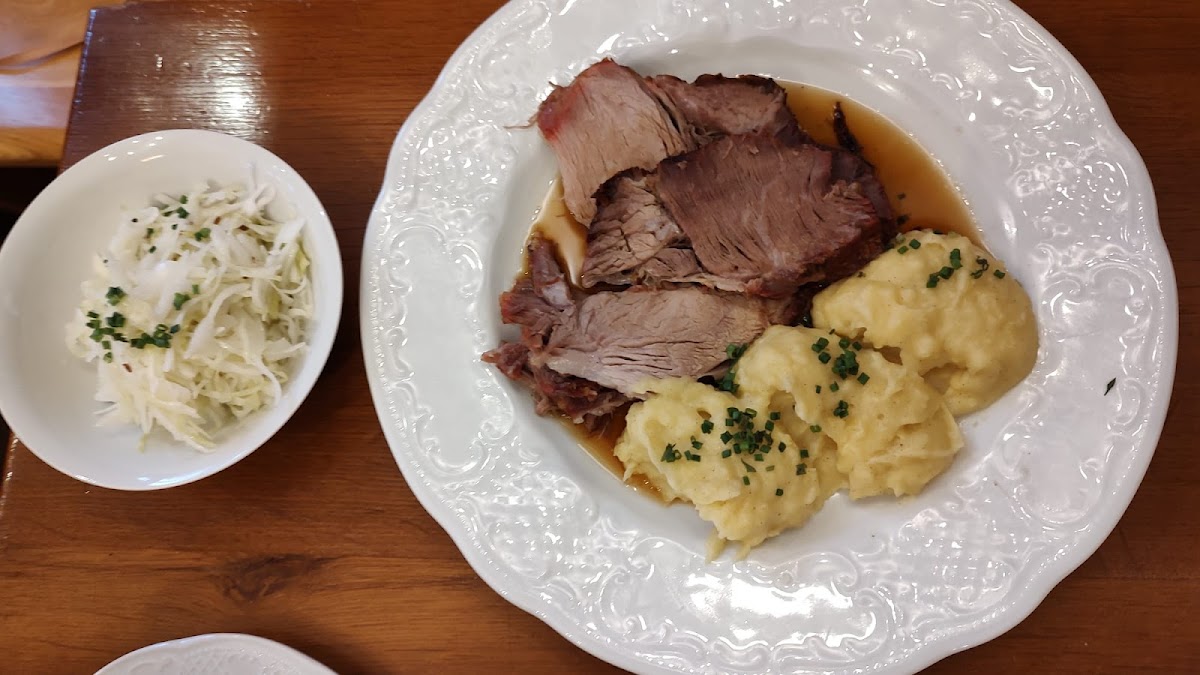 Out with two friends from the states and my dog. The place is not just dog tolerant, but clearly dog friendly - bringing a real water bowl and a little bag of treats. The service was super-friendly, but clearly not in a hurry - which was good for us because we really wanted to chat. Questions about the menu were answered patiently and completely. We ordered Schweinebraten and Gulasch and my friend ordered from their vegetarian options. They ordered beer, I got wine. All was good. It's not a cheap place. The portion size won't have you moaning in your bed. But you won't wake up hungry either. Perfect fit for us.