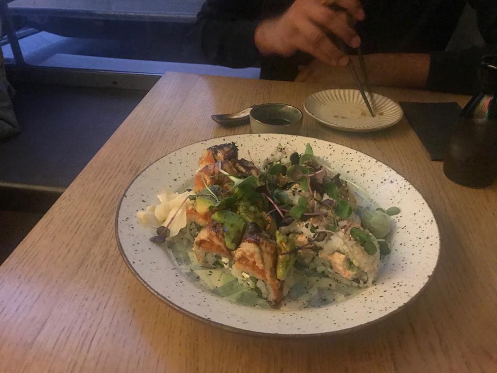 Being here twice now I can definitely recommend the place. Sushi is just fabulous and fresh. The place has a very cozy vibe and really great for dates or meeting friends. Decor modern and staff nice. I would recommend booking ahead for a reservation. I can highly recommend the Mermaid fusion role.My only complain is the connection of the cutleries. Today tea was served in a chipped cup to me that’s a but unhygienic. Prices are moderate.