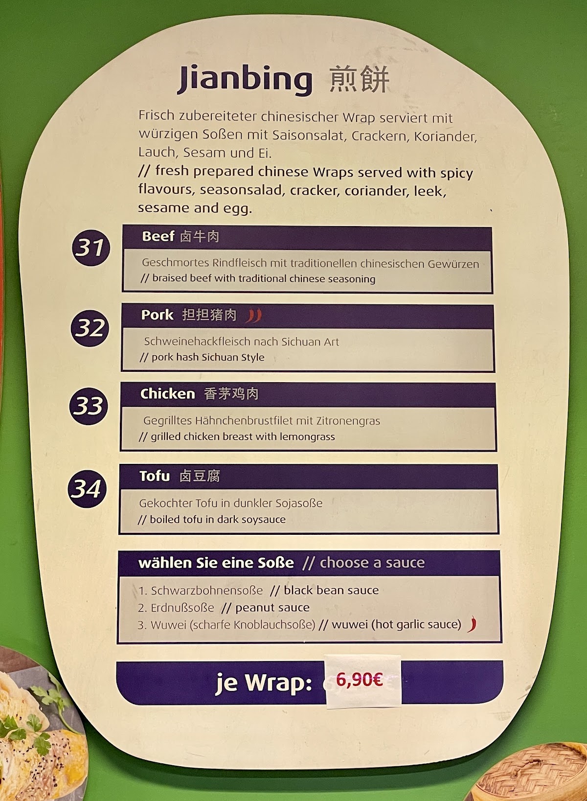 The dumplings here are not great. The skin is so thick that you can practically taste the flour in it while the filling to skin ratio is also bad. Their jian bing however is pretty decent and is worth a try, though it’s certainly priced at a pretty premium (9€+). The place is pretty cramped and poorly ventilated so it’s also probably best to do a take away.