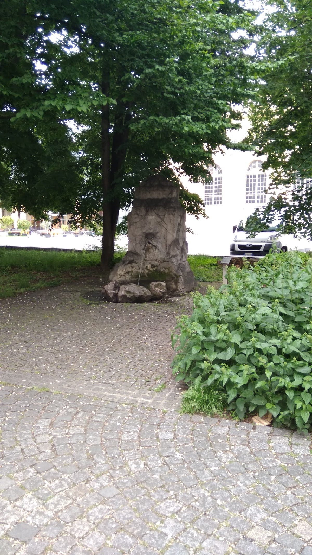 The small fountain consists of three large boulders, stacked one above the other, giving an impression of a gravestone jutting out from a pile of rocks. The front of the fountain consists of three smaller rocks protrude in front of the fountain and form a kind of basin where the water flows from an outlet that has the shape of a lion's head, hence the name the alternative name