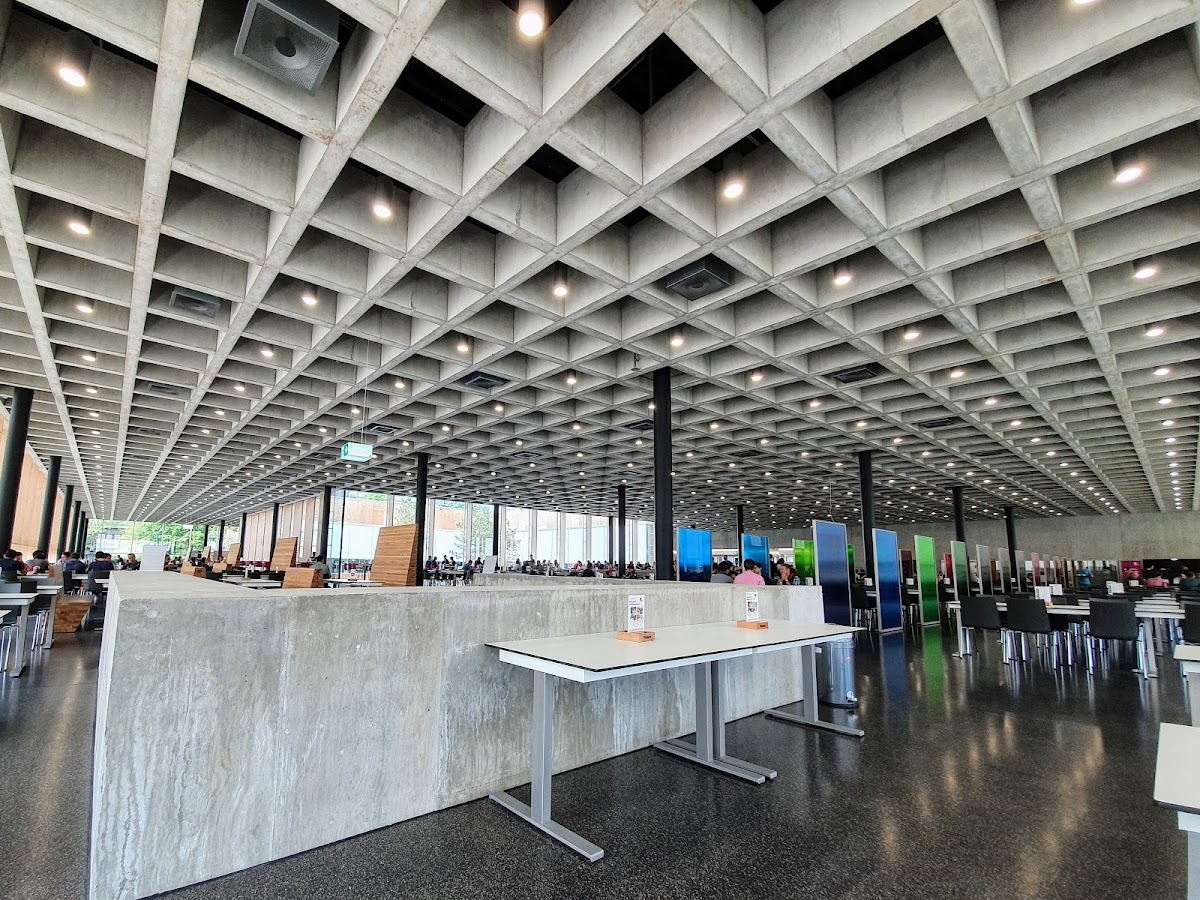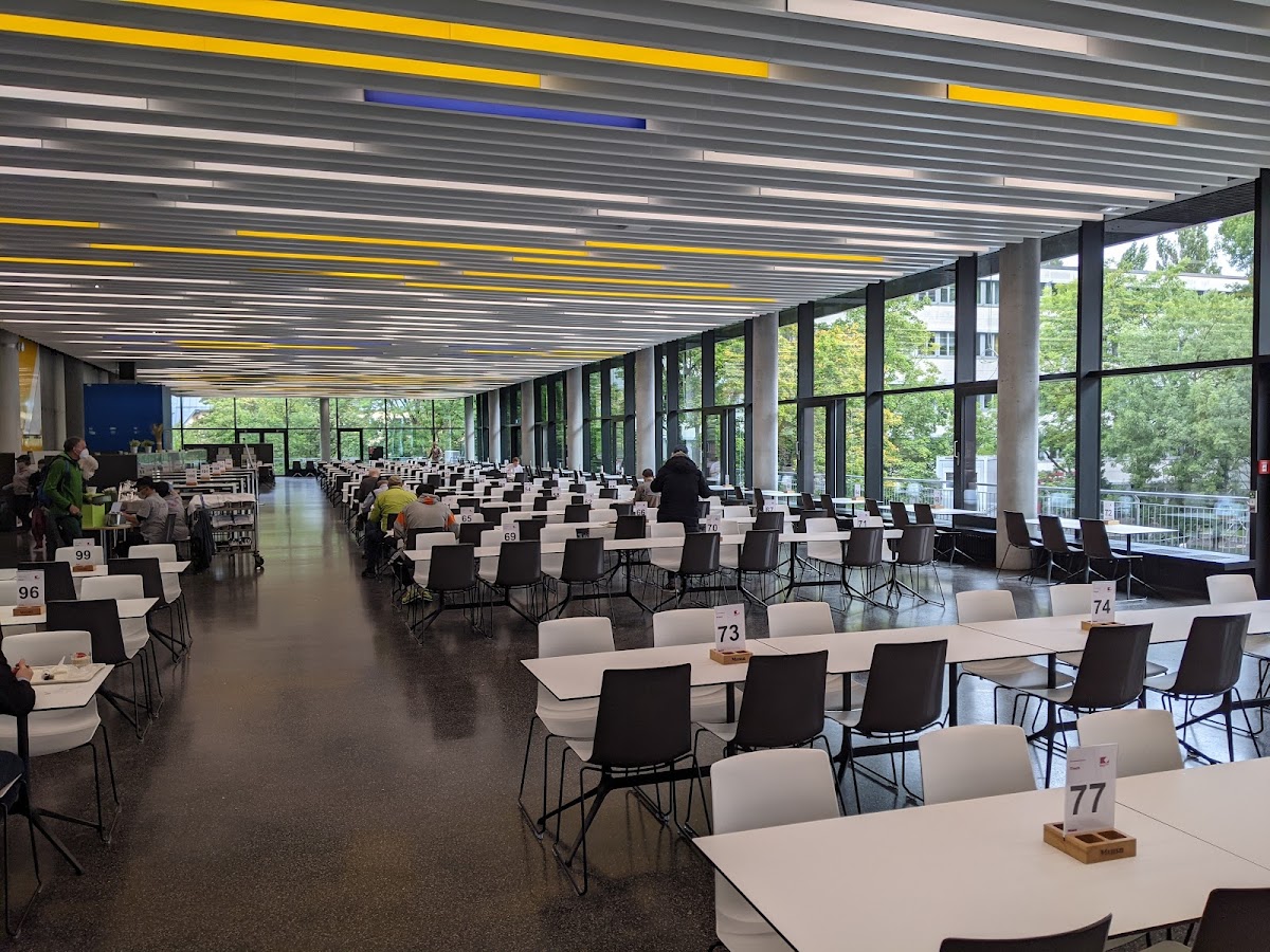 The mensa is huge and has always a very wide choice. The is also a smaller cafeteria where you can grab food faster. There is plenty of room for sitting and eating in peace, though it can get extremely busy and loud. And in summer there is no air conditioning, so I would go for a table on the terrace!