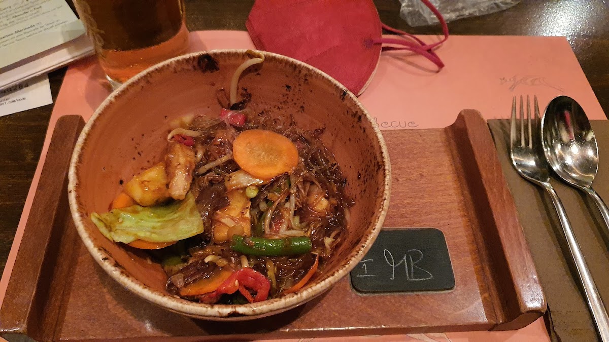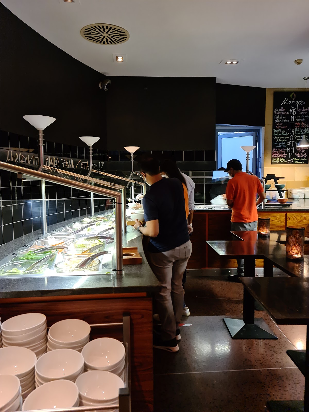 What a lovely mongolian style restaurant idea. Seating inside and out. Picture an all you can eat buffet with 30 kinds of vegetables like mushrooms, carrots, soy beans, cabbage etc., then add a choice of herbs and spices like sesame seed, spring onions and chives and finally 20 kinds of proteins, prawns, scampi, kangaroo, zebra, beef, chicken, different fish. You pick and choose from all and put it in a bowl. You choose a sauce from spicy to fruity, about 15 to choose from, and the cook puts it in a wok and stir fries. You eat it and start again with a different mix of things and repeat. A lovely exotic, oriental way to eat a new bowl every time you are finished. About 25€ for the meal and a nice selection of cocktails, wines and soft drinks. Enjoy!