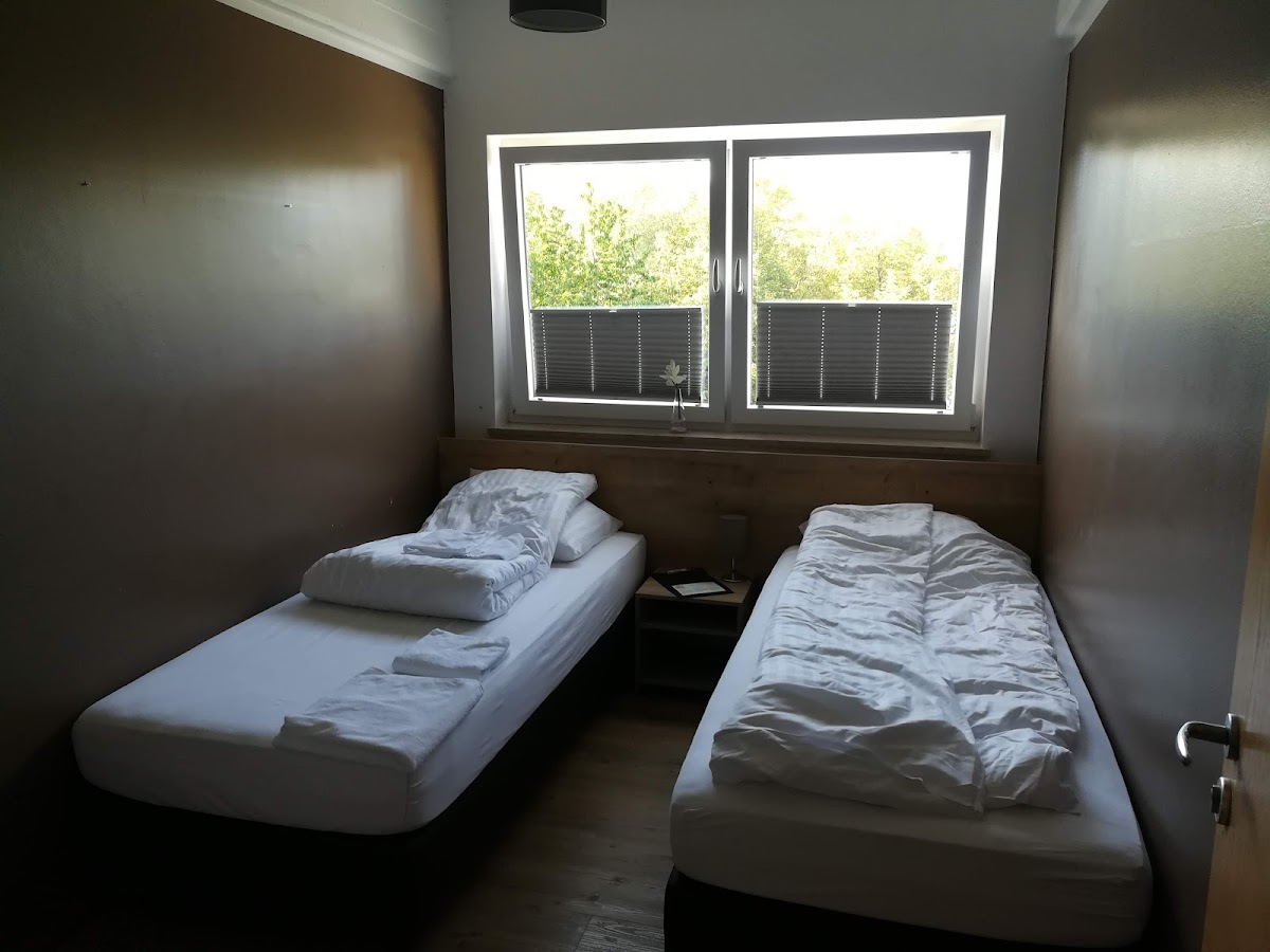 Clean, neat and affordable. No reception but instructions are easy to follow. Rooms have three beds and there are about 6 rooms to a flat with a shared kitchen. It is located by a few brothels but it doesn't take away from the overnight experience