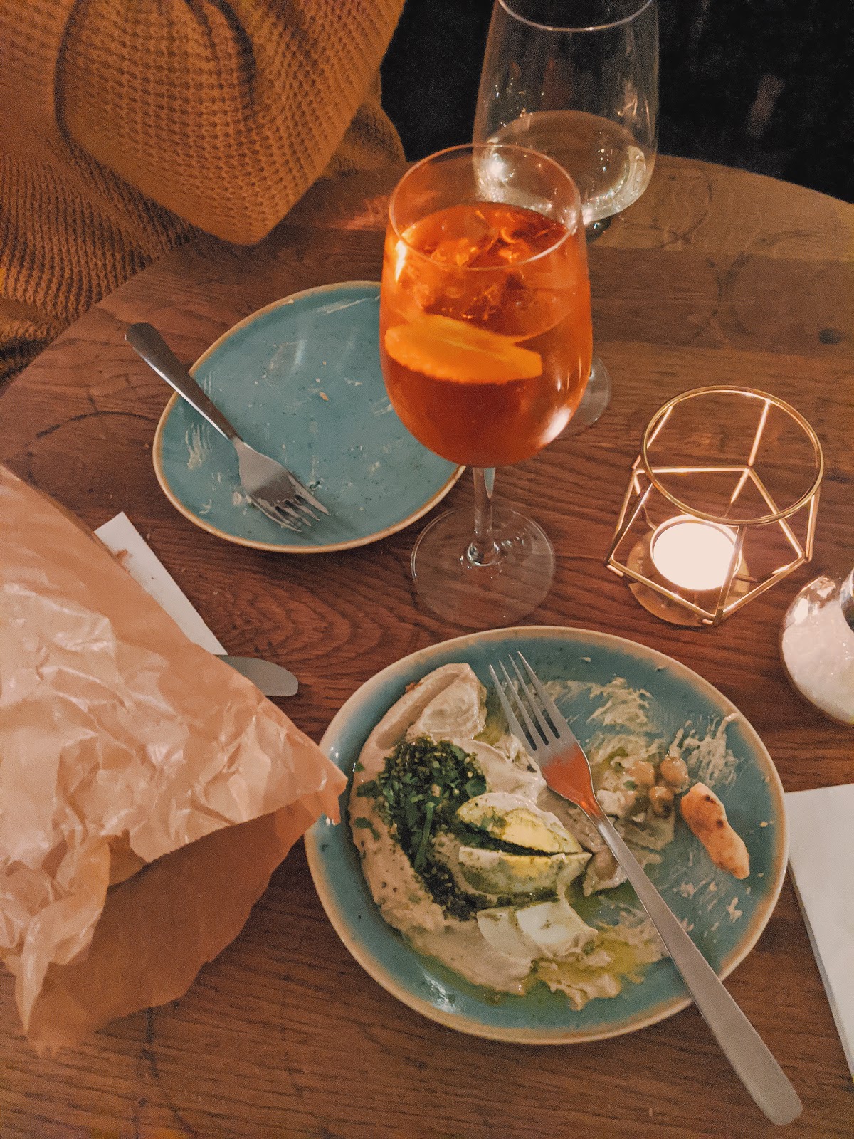 We had a verity of salads, hummus, eggplant, falafel, tahini, fresh warm pitta bread, great lemon mint drink and more...